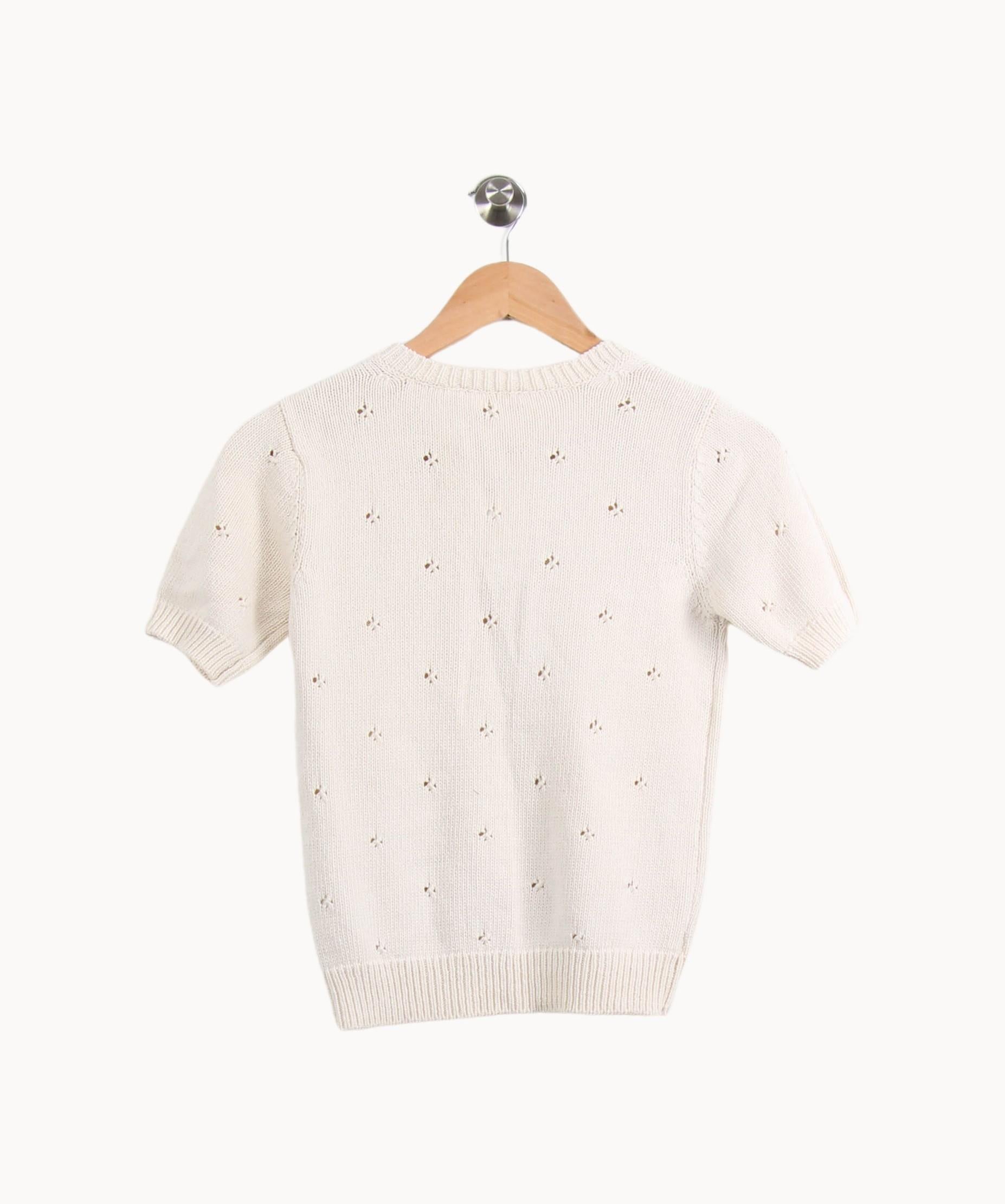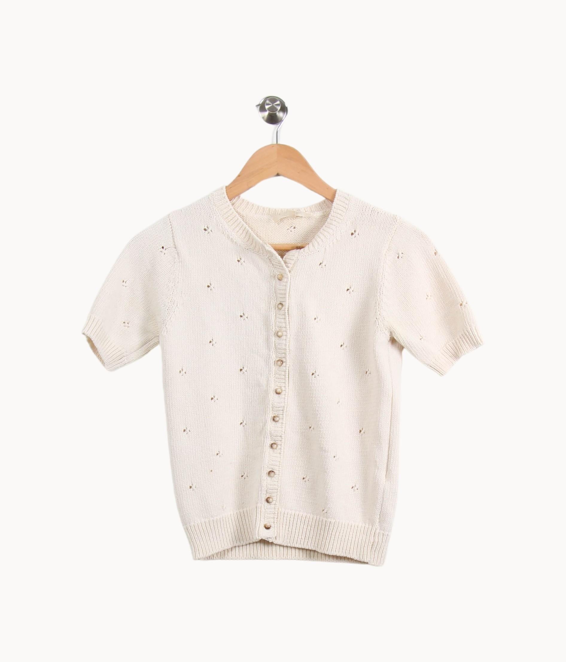 Cardigan court en maille beige Sézane, taille XS/34, manches courtes et boutonnage intégral. La matière en maille ajourée et les boutons délicats lui confèrent un charme raffiné et une touche d’originalité. Idéal pour une journée estivale en ville ou un brunch entre amis.