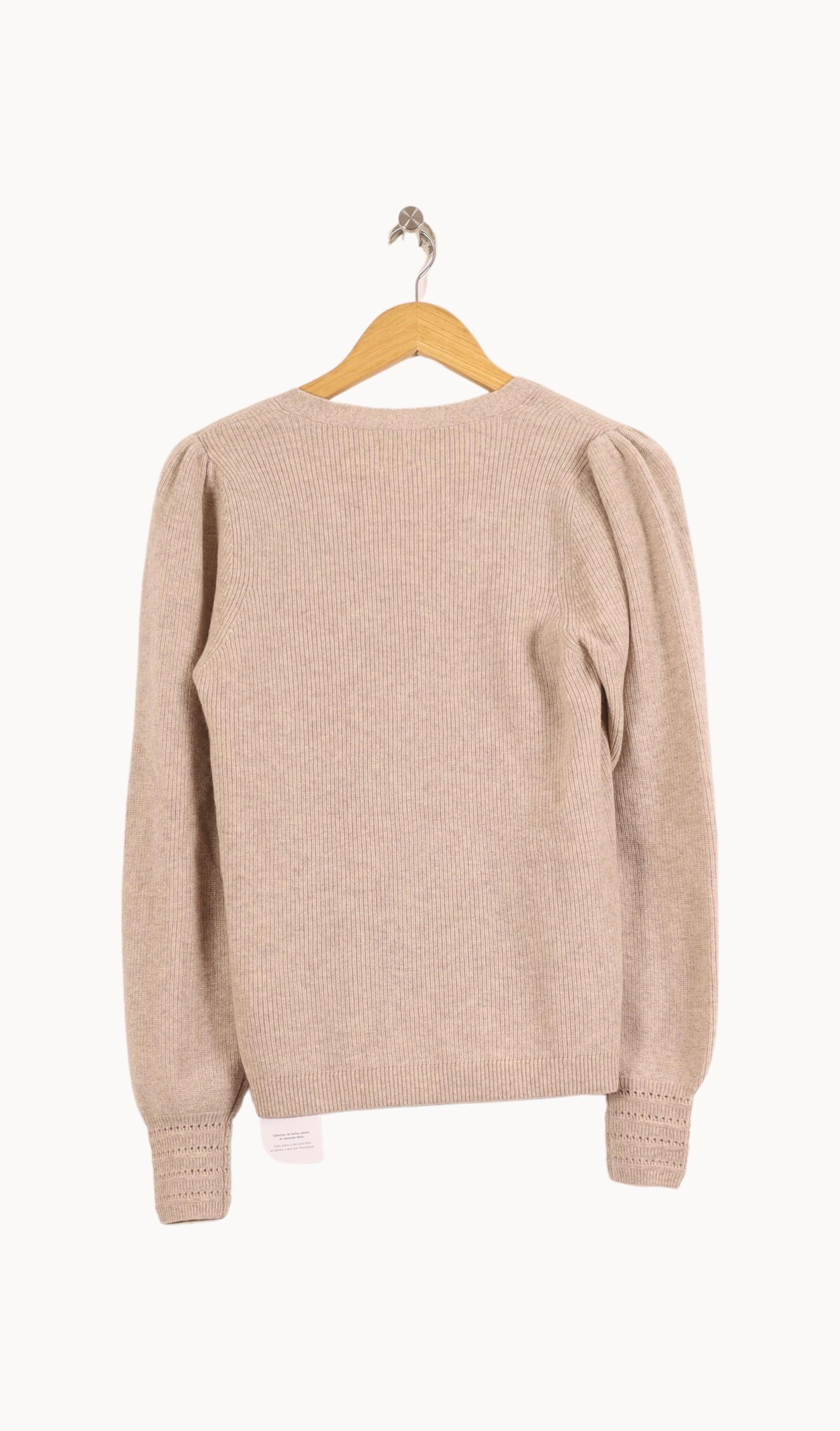 Cardigan beige en maille côtelée Des Petits Hauts, taille XS/34, élégant et polyvalent, doté d’une fermeture boutonnée sur le devant et de manches longues légèrement bouffantes. La matière tricotée offre une texture douce et un tombé fluide, rehaussé de jolis boutons dorés et de poignets délicatement travaillés pour une touche féminine unique. Ce cardigan est idéal pour une journée de travail décontractée ou pour composer une tenue élégante lors d’un brunch entre amis.
