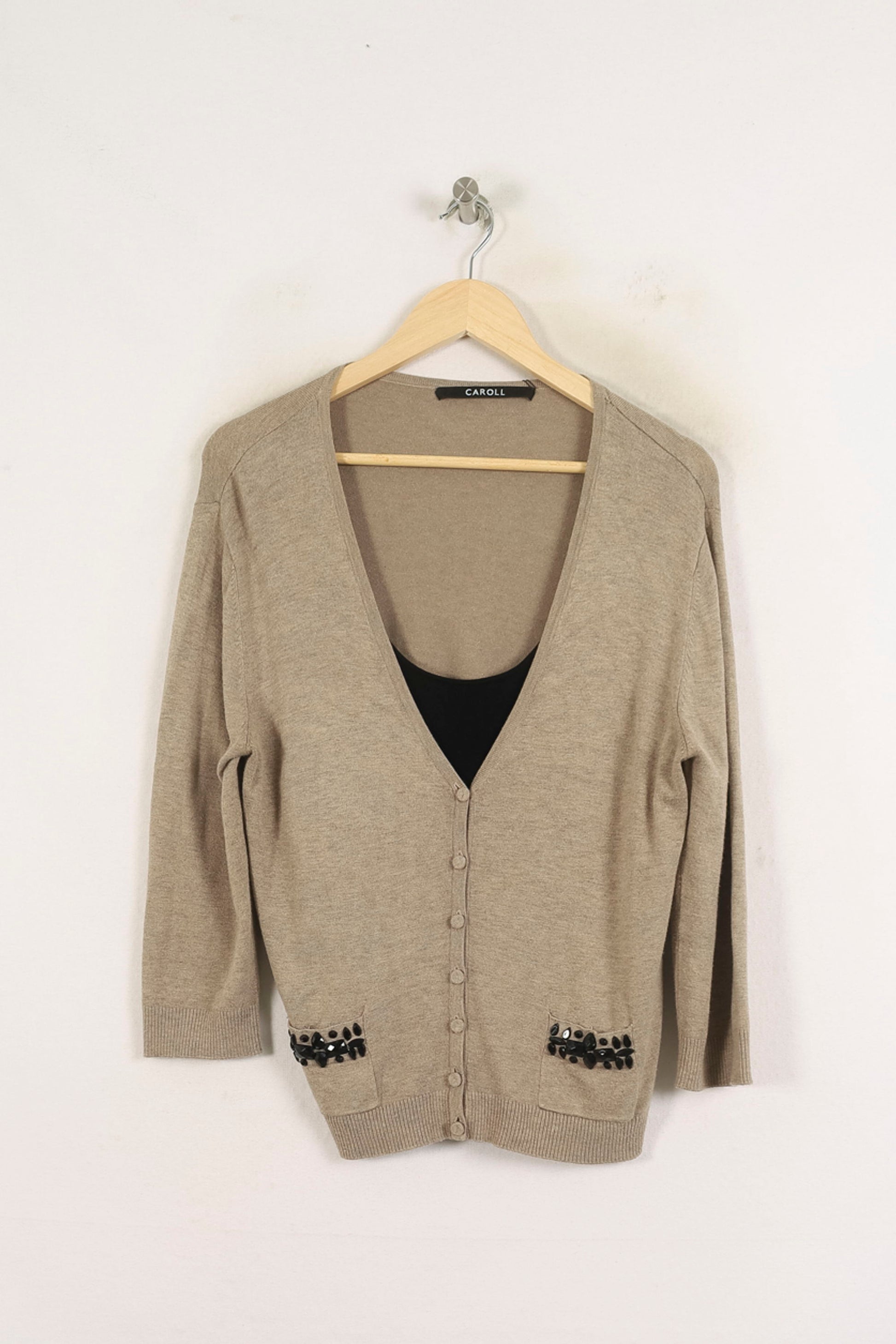 Cardigan beige Caroll taille XXL/44, confectionné en maille fine avec fermeture boutonnée et poches à détails de perles noires pour une touche sophistiquée. La matière légère et douce assure un confort optimal, tandis que les ornements sur les poches distinguent ce modèle par son raffinement discret. Idéal pour un look élégant lors d’une réunion professionnelle ou pour sublimer une tenue casual chic au quotidien.