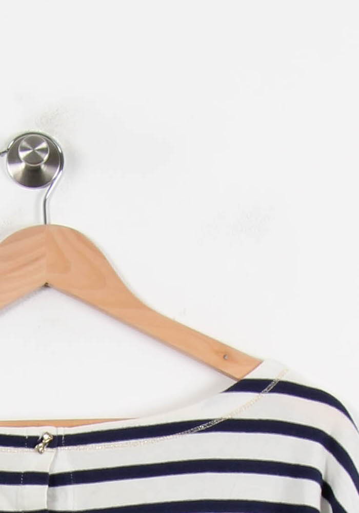 Pull marin multicolore boutonné dos Des Petits Hauts, taille XL/42, avec rayures horizontales bleu marine et blanches. Confectionné dans une matière douce et légère, ce pull se distingue par sa boutonnière dorée au dos qui apporte une touche élégante et sophistiquée à un basique intemporel. Idéal pour une journée décontractée en ville ou une promenade en bord de mer, associé à un jean ou une jupe fluide.