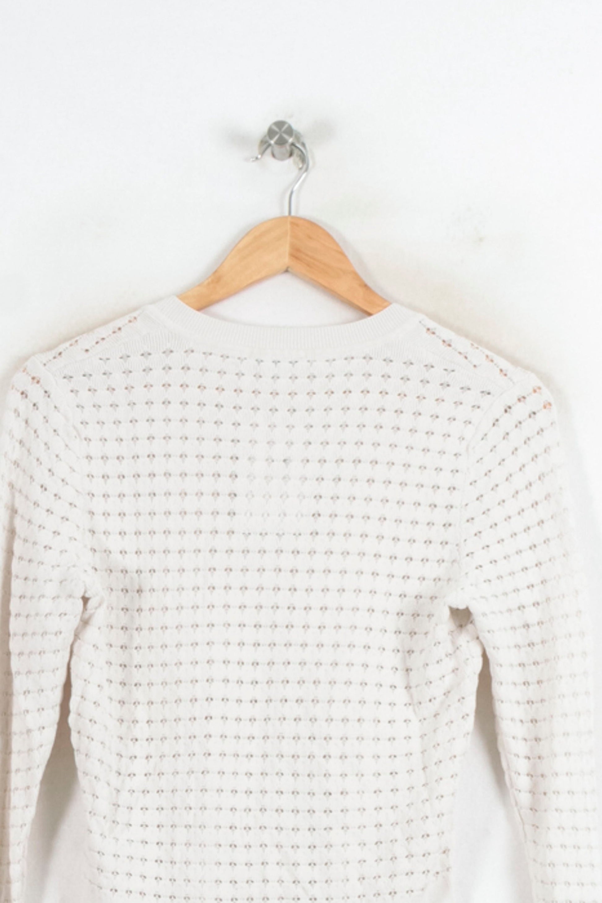 Cardigan blanc femme Sandro taille L/40, élégant et raffiné, parfait pour une allure intemporelle et féminine. Confectionné dans une maille ajourée délicate, il présente un motif perforé régulier et une finition en bord-côte pour une touche sophistiquée. Idéal à porter lors d’un déjeuner en terrasse ou pour agrémenter une tenue de bureau chic.