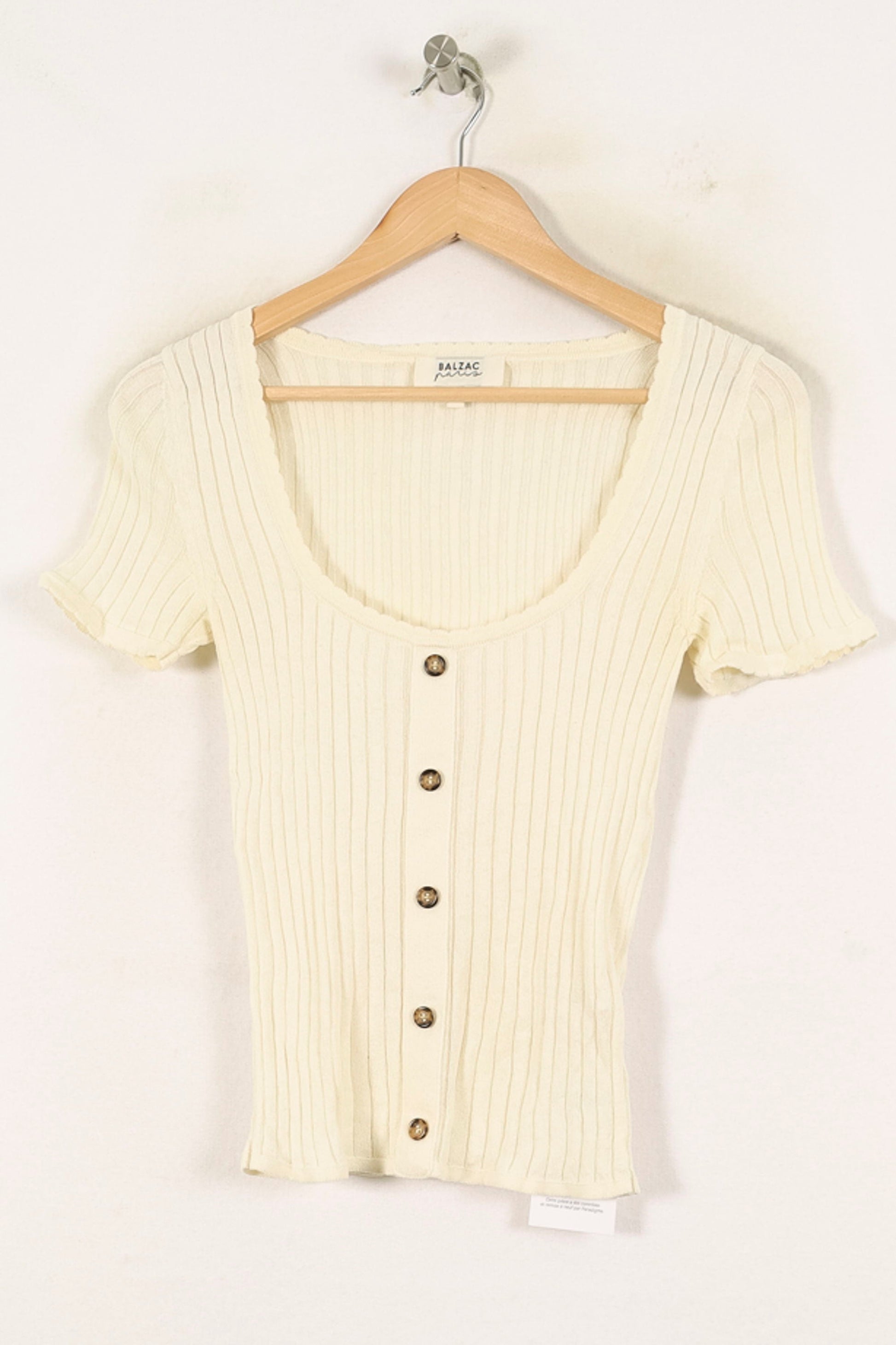 Top boutonné col rond Balzac Paris, taille S/36, coloris blanc. Confectionné dans une maille côtelée, ce haut se distingue par ses boutons effet écaille sur le devant et la finition délicatement ondulée des manches, qui lui confèrent une touche élégante et intemporelle. Parfait pour une journée décontractée en ville ou pour un déjeuner en terrasse.