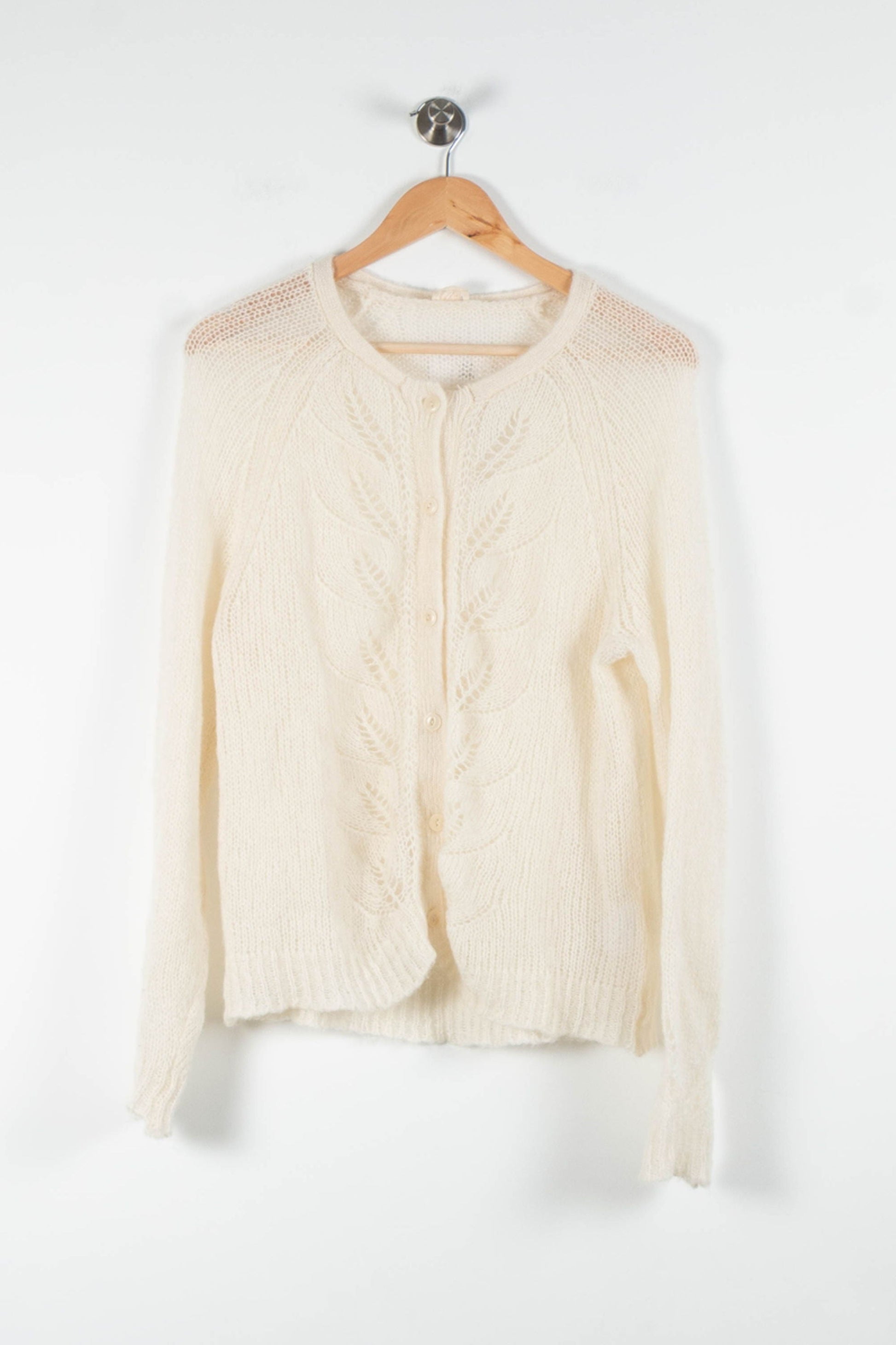 Cardigan blanc Ekyog, taille S/36 – un modèle raffiné à la maille délicate pour une allure élégante. Confectionné dans une matière douce, ce cardigan se distingue par ses motifs ajourés en forme de feuilles sur le devant, ainsi que par sa patte de boutonnage discrète et ses finitions soignées, offrant un charme naturel et subtil. Idéal pour accompagner une tenue de bureau ou sublimer une sortie entre amis lors des journées fraîches.
