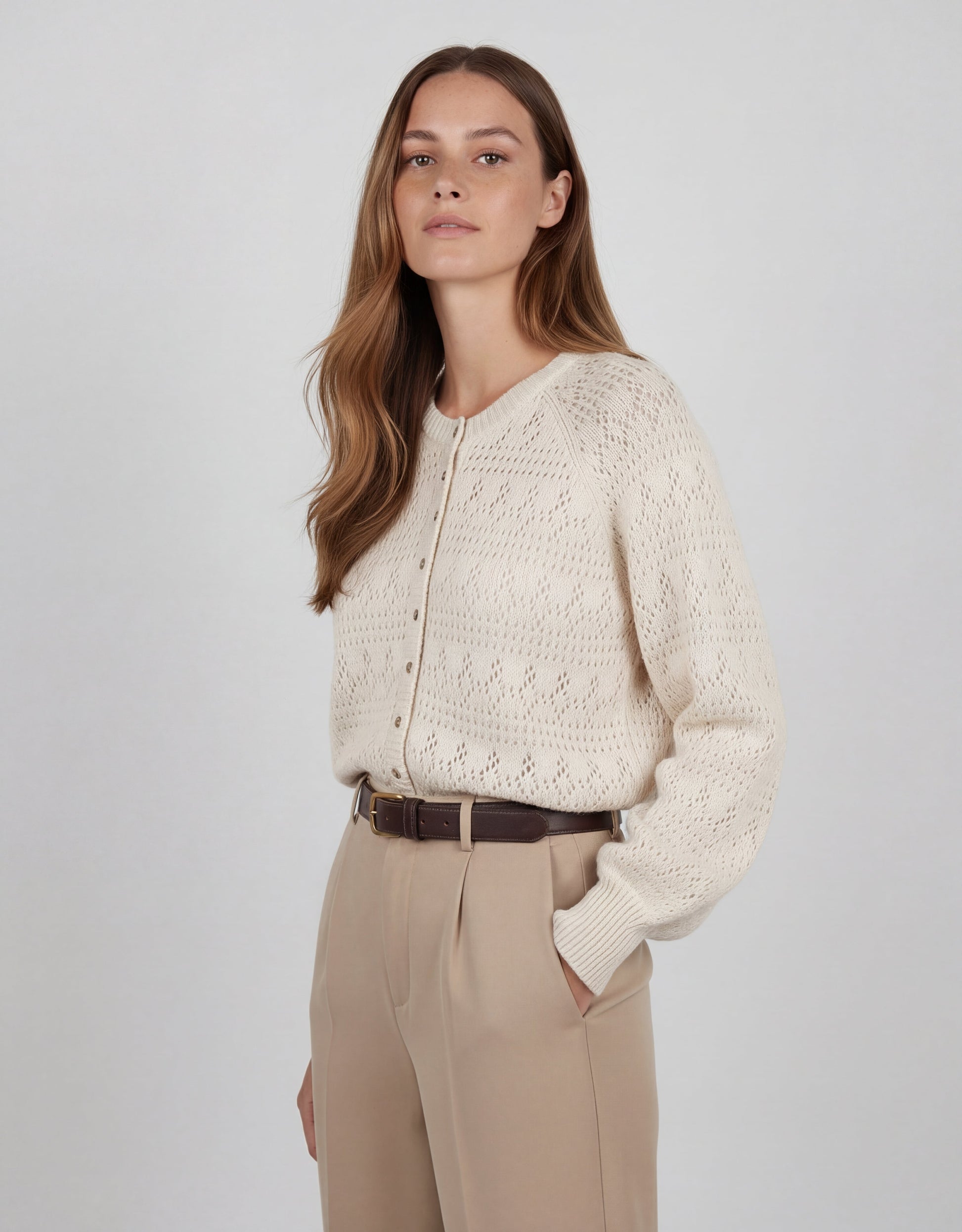 Cardigan blanc Sézane en taille XS/34, confectionné dans une maille ajourée élégante à boutons. Sa matière en tricot ajouré lui confère une allure légère et raffinée, tandis que ses boutons nacrés apportent une touche de sophistication qui le distingue. Parfait pour une soirée printanière, sur une robe légère ou un jean taille haute.