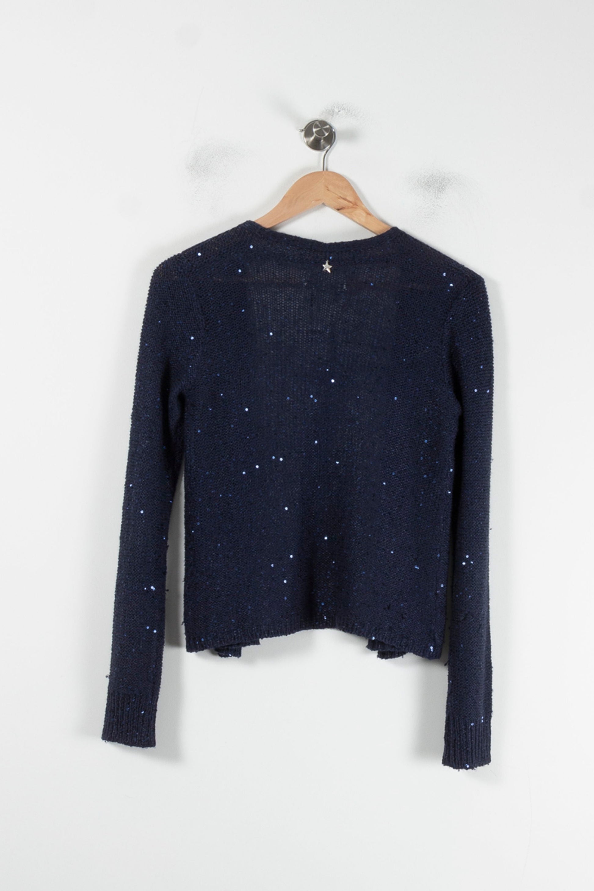 Cardigan bleu marine Sud Express, taille S/36, élégant et intemporel, doté de manches longues et d’une coupe ouverte sans boutons. Confectionné dans un mélange doux de polyester, coton et laine, ce cardigan se distingue par ses fines paillettes intégrées, qui lui apportent une touche subtilement scintillante et raffinée. Parfait pour illuminer une tenue de bureau ou pour réchauffer vos soirées entre amis avec sophistication.
