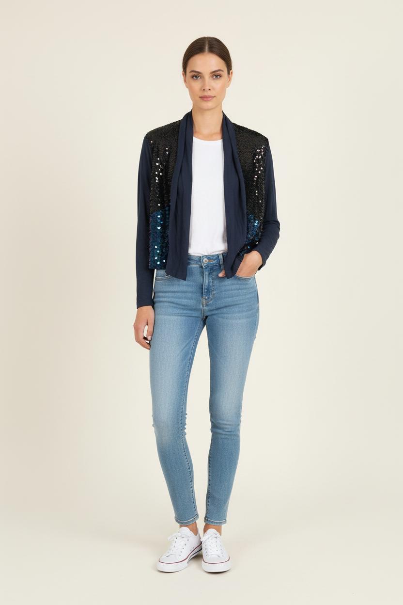 Cardigan bleu à sequins Bérénice, taille S/36, idéal pour ajouter une touche d’élégance à votre vestiaire. La matière fluide se distingue par un jeu de sequins brillants positionnés sur tout le devant du cardigan, conférant au vêtement un éclat raffiné et une allure unique. Ce modèle s’accorde parfaitement pour une soirée, un dîner chic ou toute occasion spéciale nécessitant une pièce à la fois sophistiquée et originale.
