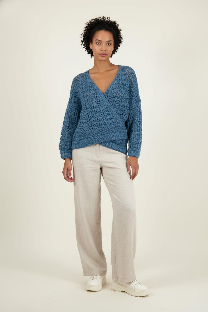 Cardigan bleu Karma Koma, en taille unique, aux lignes amples et féminines. Confectionné en un délicat mélange de 35% mohair, 55% acrylique et 10% laine, ce modèle présente un tricot ajouré et des manches longues bouffantes qui lui confèrent une touche d’originalité et de douceur exceptionnelle. Idéal pour réchauffer une tenue lors d’un brunch entre amis ou d’une balade automnale.