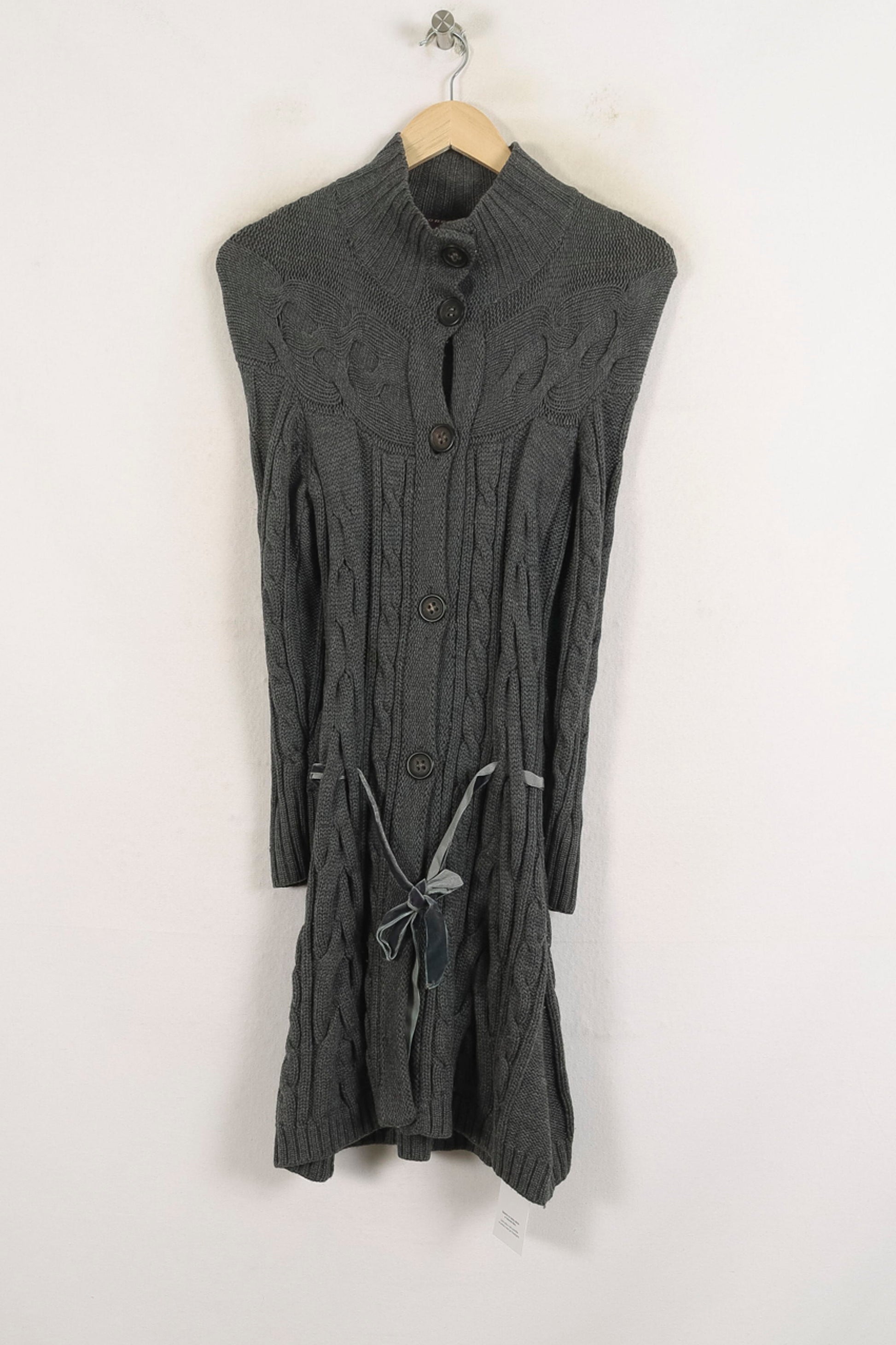 Cardigan long gris à boutons, taille S/36, de la marque One Step. Confectionné dans une maille torsadée épaisse, ce cardigan se distingue par son col montant, sa fermeture boutonnée sur toute la longueur ainsi que sa ceinture à nouer pour sublimer la silhouette. Idéal pour apporter élégance et confort lors d’une journée de travail ou d’une sortie hivernale en toute simplicité.