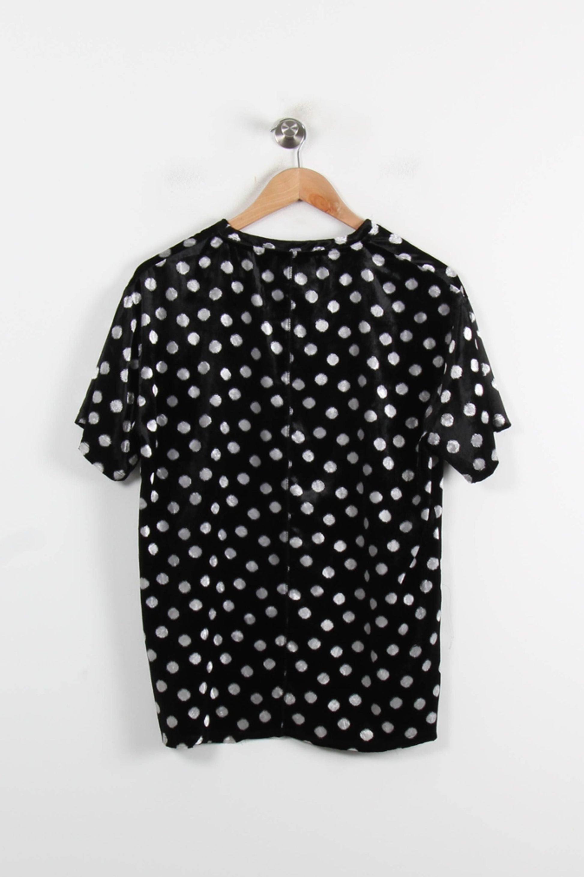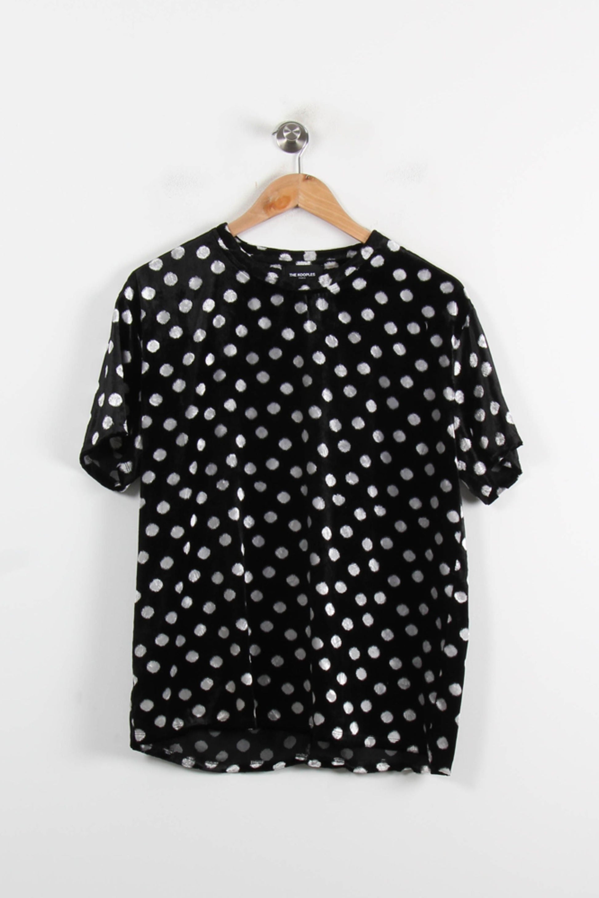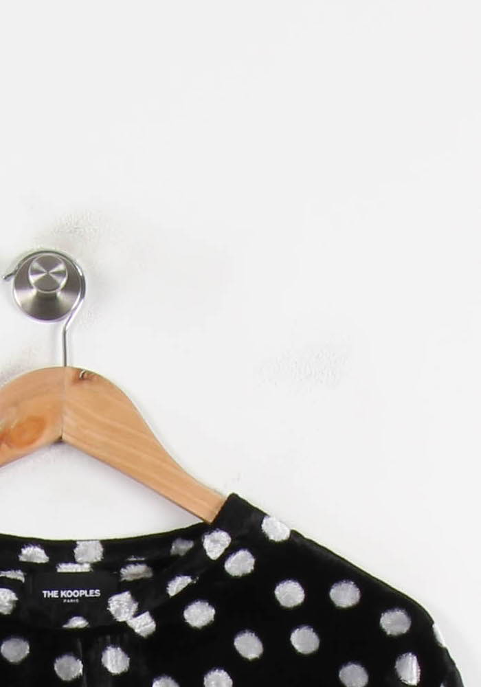 Top The Kooples à pois, taille M/38, coloris noir. Réalisé dans une matière fluide et légèrement brillante, ce haut se distingue par son motif à pois blancs qui lui apporte une touche moderne et graphique. Idéal pour une soirée décontractée ou un dîner entre amis, il s’adapte facilement à un style chic et tendance.
