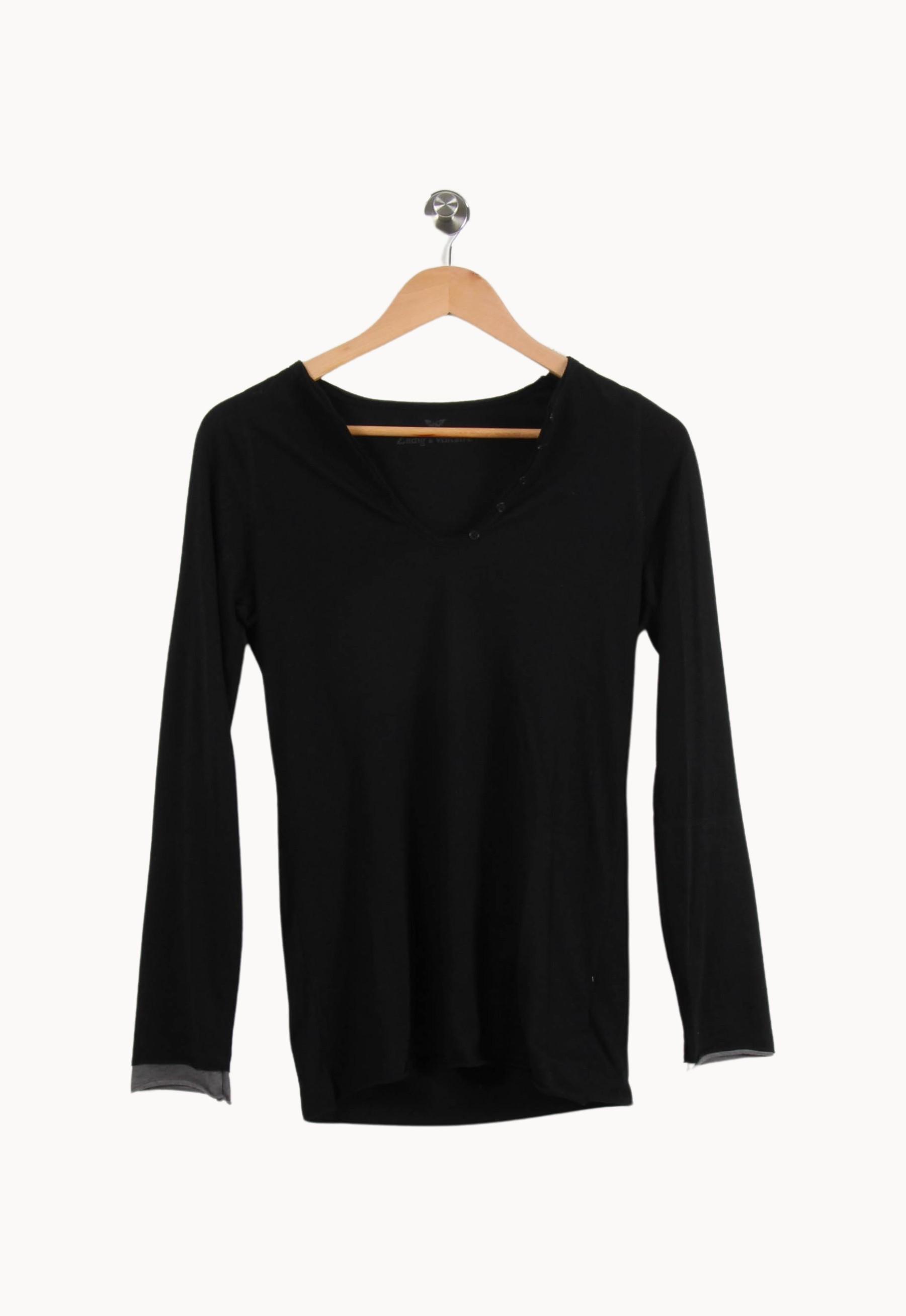 Top noir à manches longues Zadig&Voltaire, taille S/36, alliant simplicité et élégance. Confectionné dans une matière fluide, ce haut se distingue par une encolure légèrement boutonnée et des revers de manches contrastants, apportant une touche subtile d’originalité à ce basique intemporel. Idéal pour une journée de travail raffinée ou une sortie décontractée entre amis.