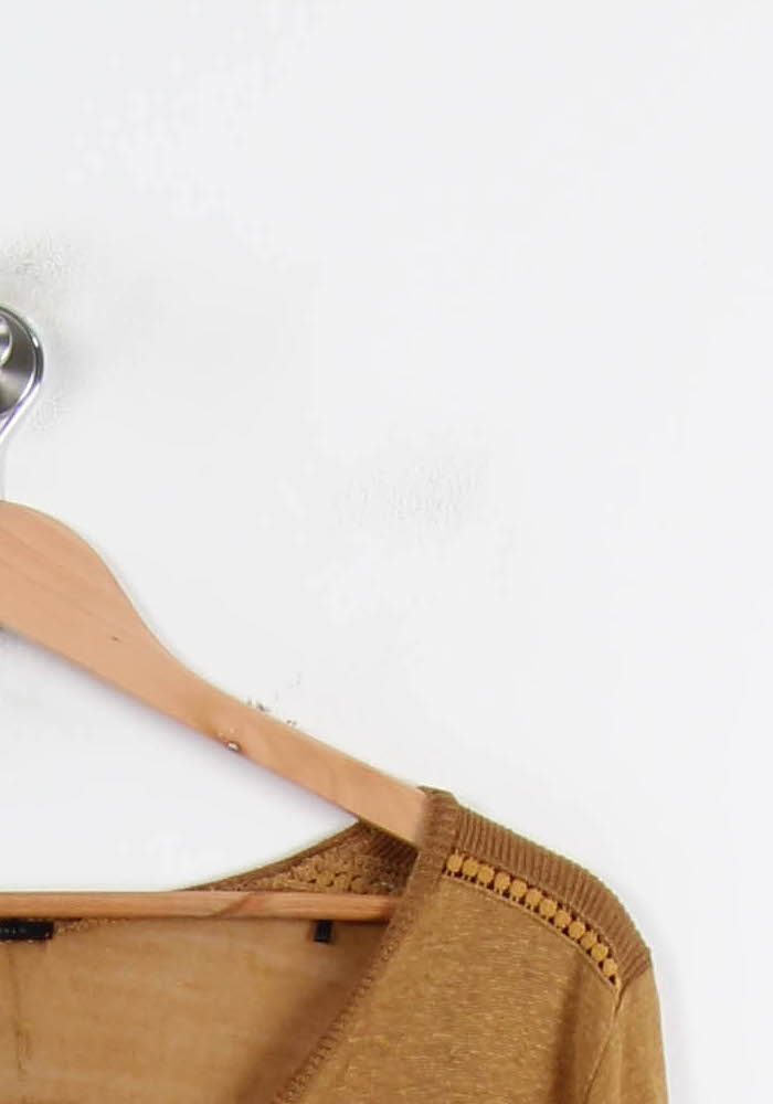 Top IKKS doré à manches longues, col V, taille M/38. Confectionné dans une matière fluide à l’aspect léger, ce haut se distingue par des finitions en maille ajourée sur les épaules qui lui confèrent une touche de raffinement. Idéal pour une journée au bureau ou un brunch décontracté entre amis.