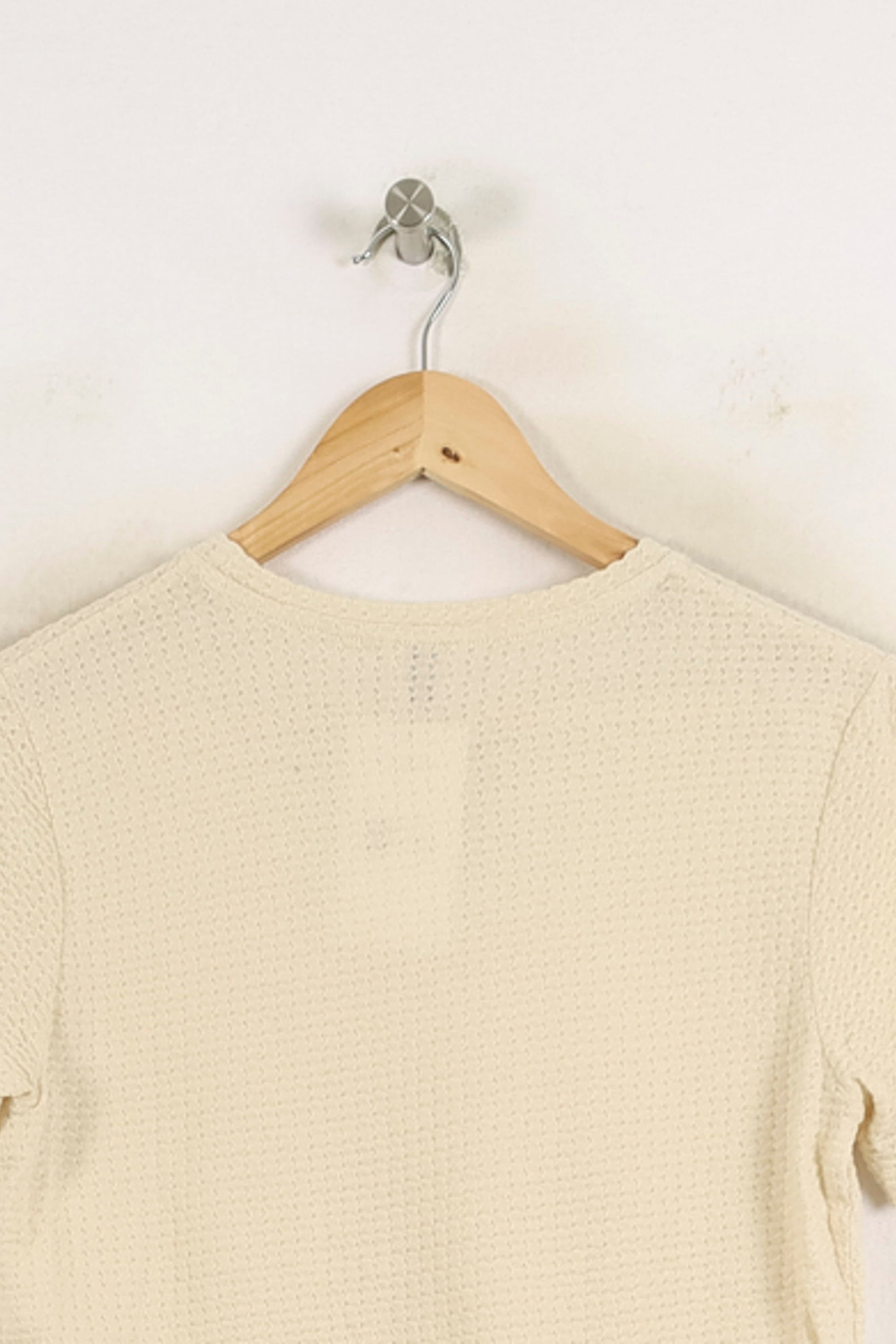 Top beige Ines de la Fressange Paris, taille S/36, à la coupe classique et élégante. Confectionné dans une matière texturée façon nid d’abeille, ce haut se distingue par sa douceur ainsi que par la subtilité de son motif en relief, apportant raffinement et originalité à votre tenue. Parfait pour une journée de travail ou un déjeuner raffiné entre amis.