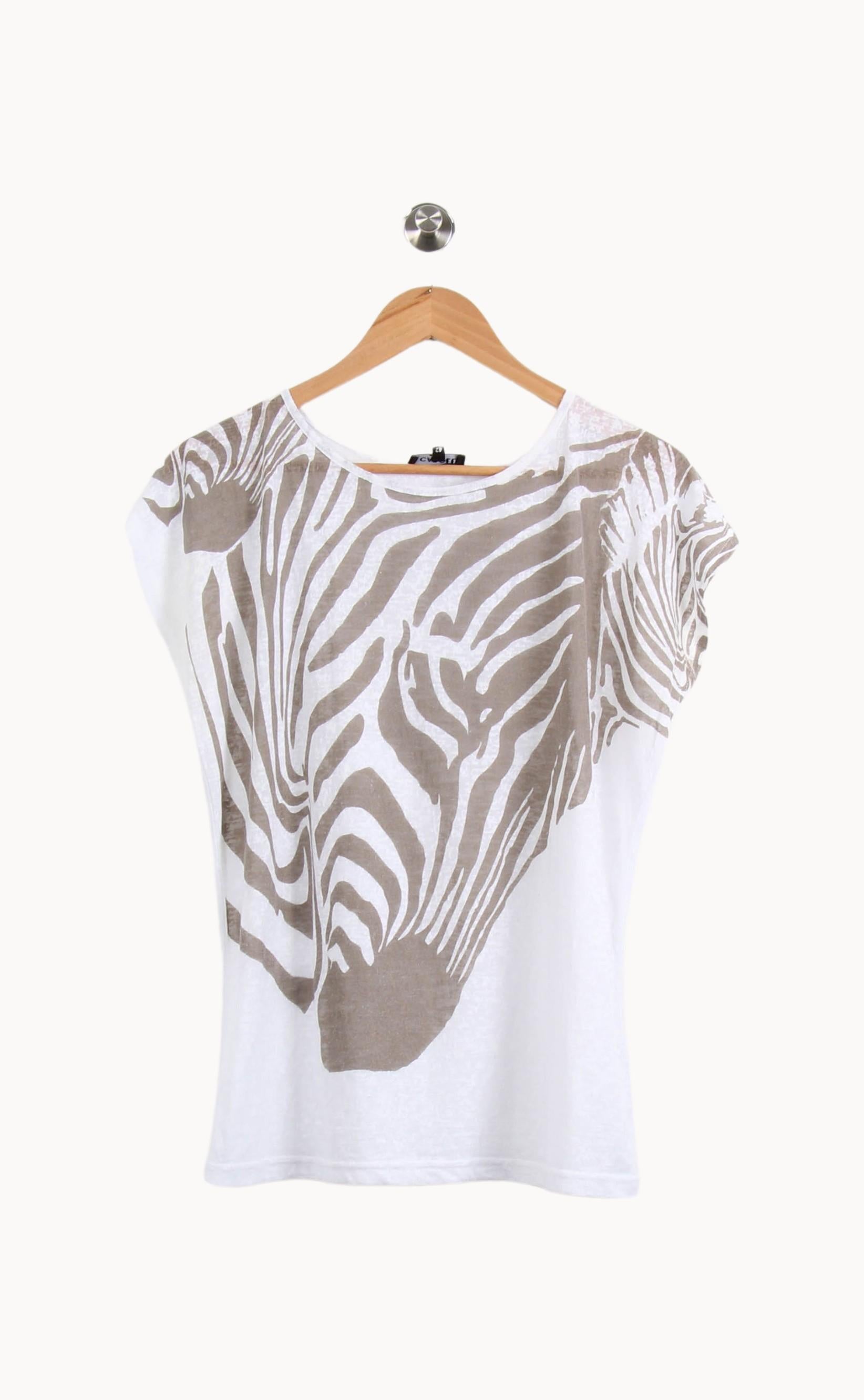 Top blanc Caroll taille XL/42, imprimé zébré beige original sur le devant, alliant style moderne et sobriété. Le tissu aérien met en valeur une coupe fluide et des manches courtes, tandis que l’imprimé animalier confère à la pièce une allure unique et contemporaine. Parfait pour un look casual chic lors d’une sortie estivale ou d’un déjeuner en terrasse.