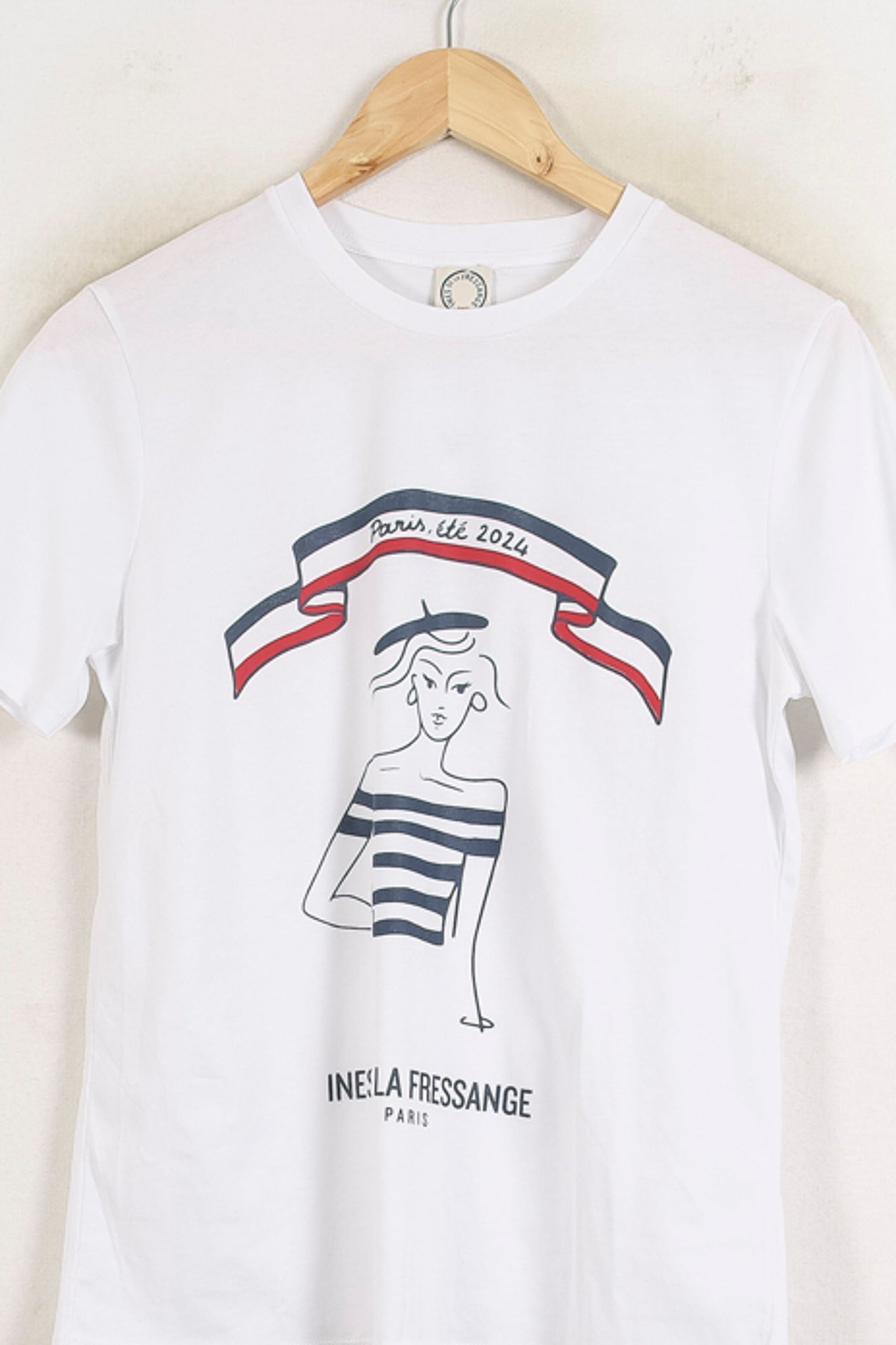 T-shirt blanc « Paris, été 2024 » Ines de la Fressange Paris, taille S/36, affichant un motif graphique élégant sur le devant. Confectionné dans une matière douce et confortable, ce haut se distingue par son illustration façon esquisse typiquement parisienne et le détail d’un ruban tricolore, signature discrète et raffinée de la maison Ines de la Fressange Paris. Idéal pour une balade estivale à Paris ou un rendez-vous décontracté en ville.