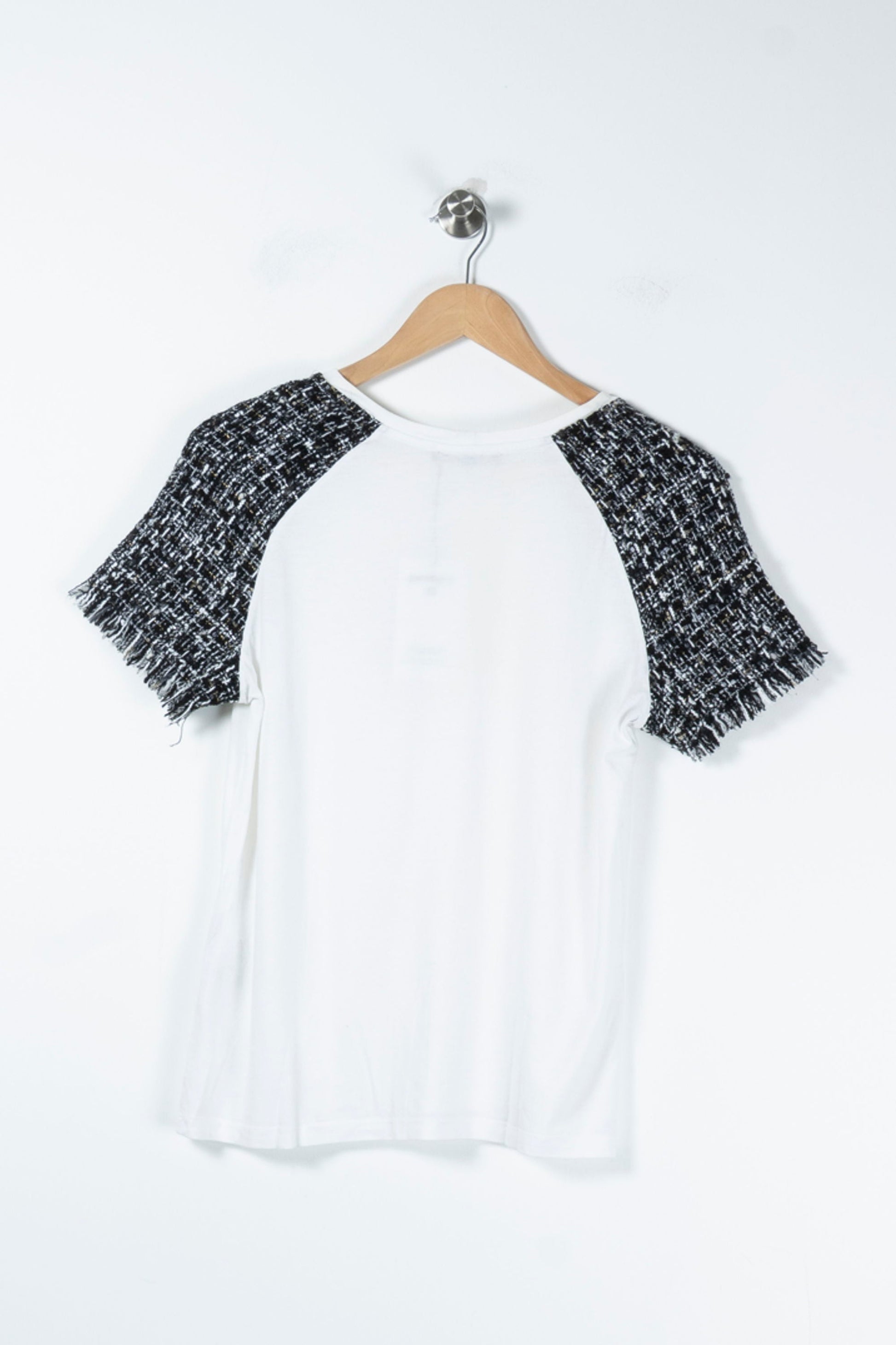 Top Maje blanc taille L/40, manches courtes contrastées noires et blanches, coupe modernisée et élégante. Confectionné en 50% modal et 50% coton, il assure confort et douceur, tandis que les manches bicolores à effet tweed et franges apportent une touche sophistiquée et originale à ce basique revisité. Idéal pour une journée de bureau décontractée ou un brunch entre amis.