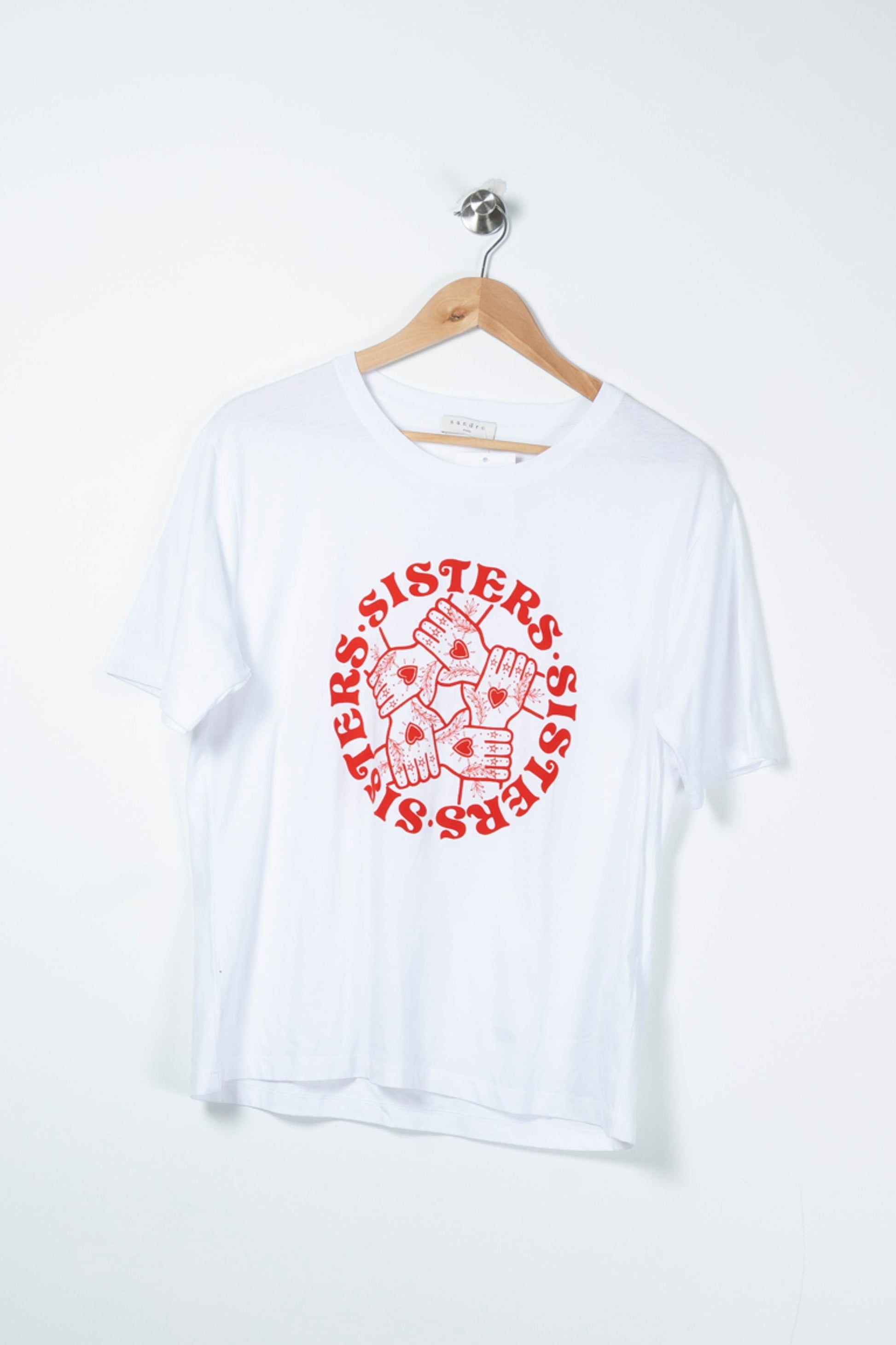 T-shirt blanc imprimé Sisters Sandro taille L/40, un top casual à l’esprit affirmé par la maison Sandro. Confectionné en 100% coton, ce t-shirt se distingue par son imprimé rouge "SISTERS" entourant des motifs de mains, conférant à la pièce un caractère unique et graphique. Idéal pour une sortie entre amis ou une balade citadine, il s'accorde facilement à une garde-robe décontractée et tendance.