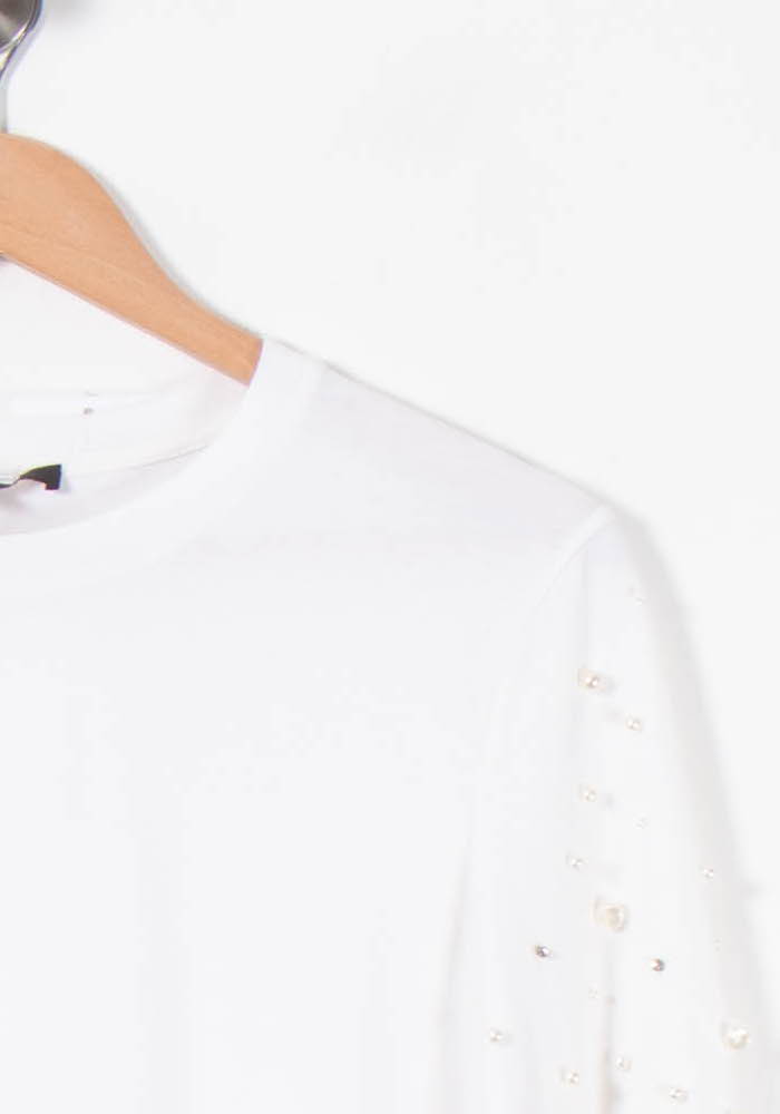 Top blanc Maje, taille L/40, manches ornées de perles. Les manches courtes sont sublimées par une délicate broderie de perles, ajoutant une touche d’élégance et de raffinement à ce modèle classique. Idéal pour une sortie chic ou un déjeuner élégant entre amis.