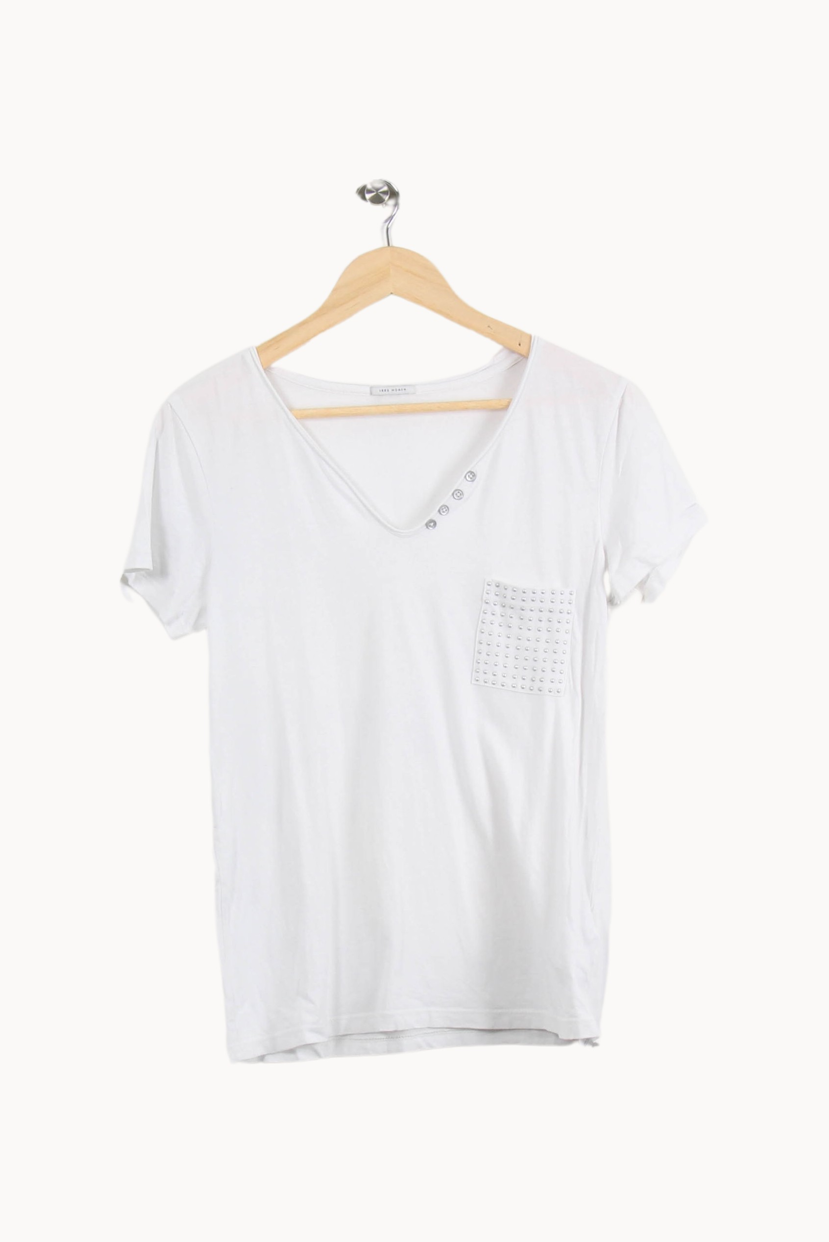 T-shirt blanc IKKS, taille M/38, au design épuré avec col en V et poche poitrine ornée de rivets argentés. Confectionné dans une matière douce au toucher, il présente une finition raffinée avec quatre petits boutons décoratifs à l’encolure et une poche dont les clous apportent une touche moderne et originale. Idéal pour composer une tenue décontractée chic lors d’un brunch ou d’une sortie entre amis.