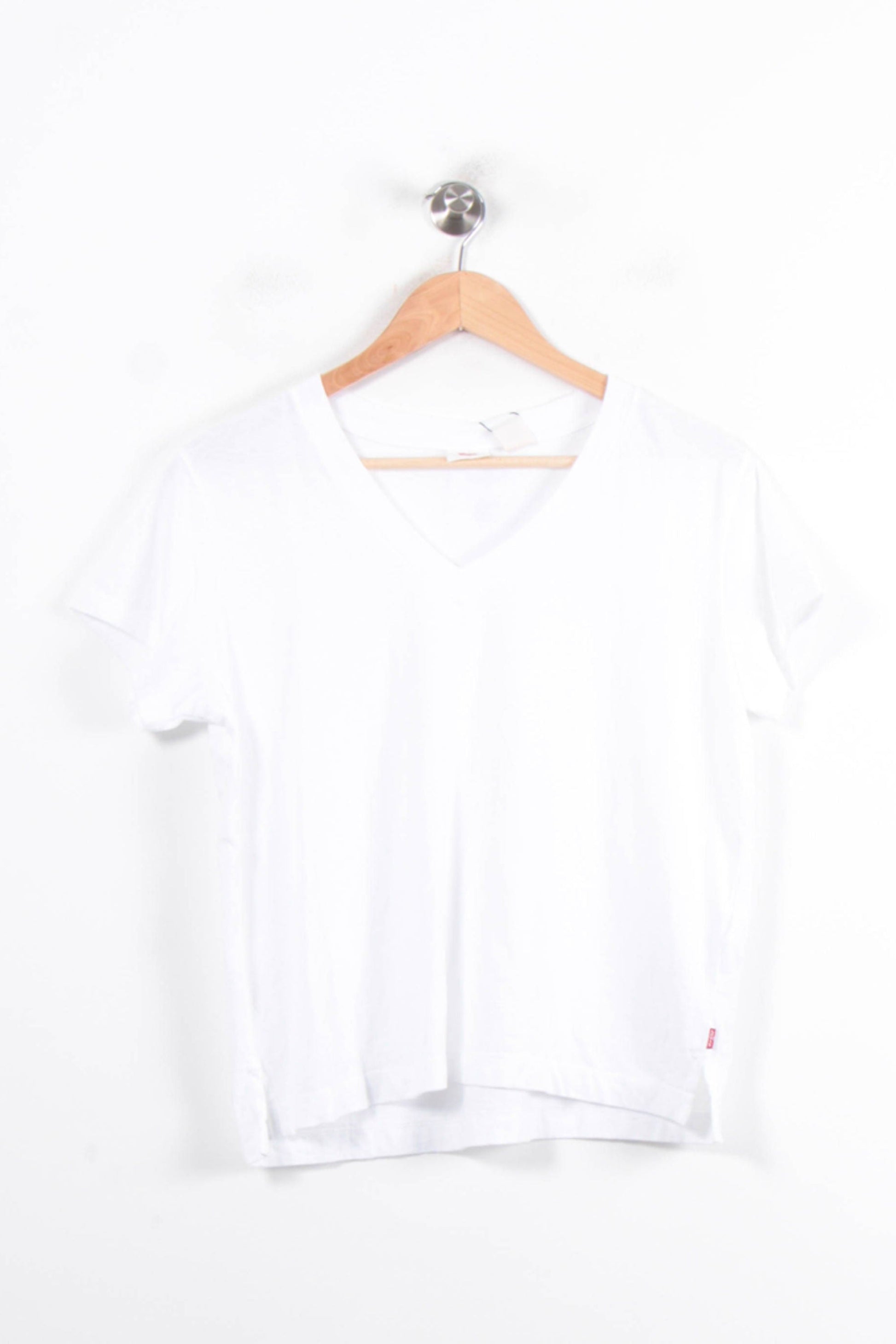 T-shirt blanc Levi's à col V, taille S/36, modèle épuré et intemporel. Confectionné dans une matière douce et légère, il se distingue par sa coupe classique, son col en V flatteur et la discrète étiquette rouge siglée Levi's sur le bas du vêtement, gage d’authenticité. Parfait pour une journée décontractée ou pour composer un look casual chic au bureau.