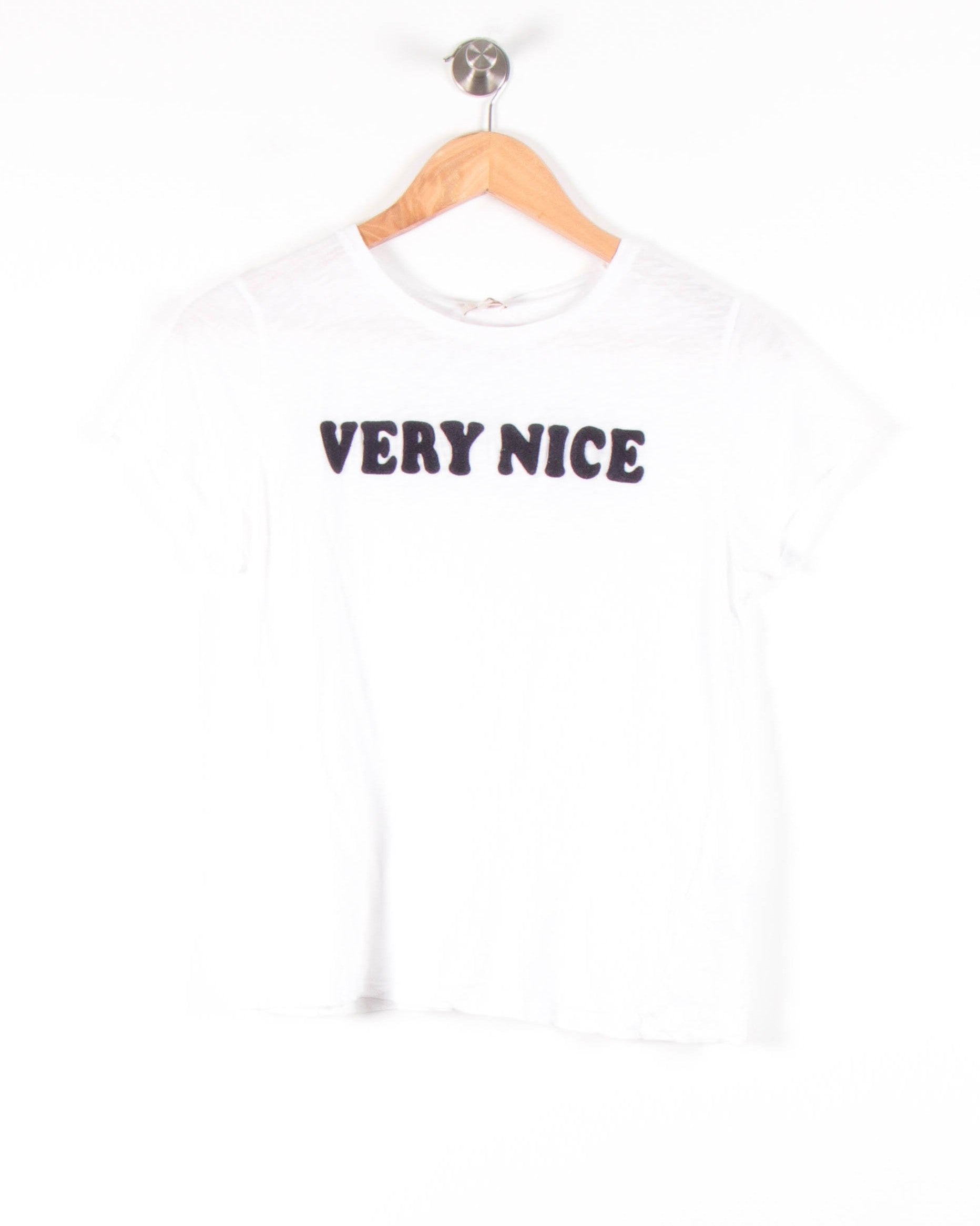 T-shirt blanc "Very Nice" Pablo, taille S/36, marque Pablo. Confectionné dans une matière légère et agréable, ce t-shirt se distingue par son inscription noire « VERY NICE » en lettres capitales sur le devant, offrant une touche moderne et graphique à un basique intemporel. Idéal pour un look casual lors d’une sortie en ville ou pour un moment de détente entre amis.