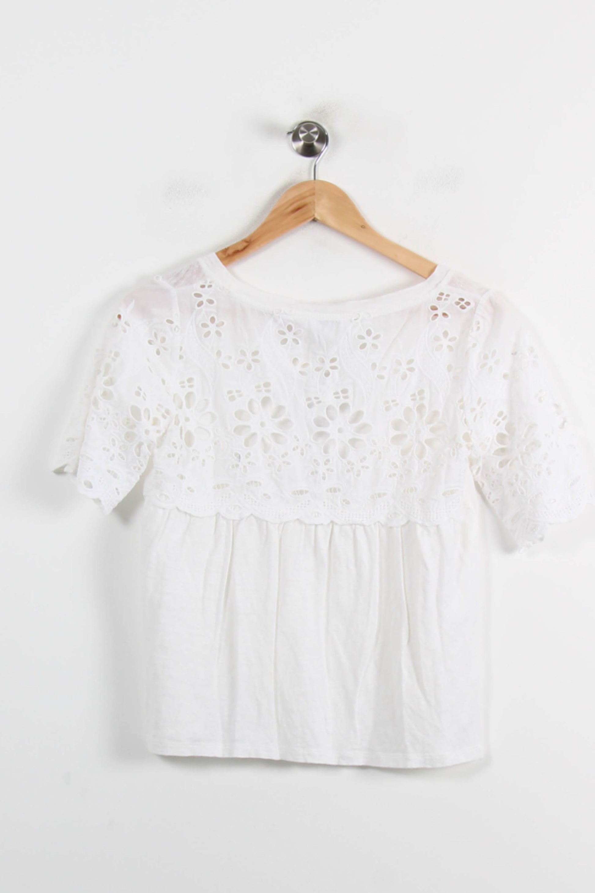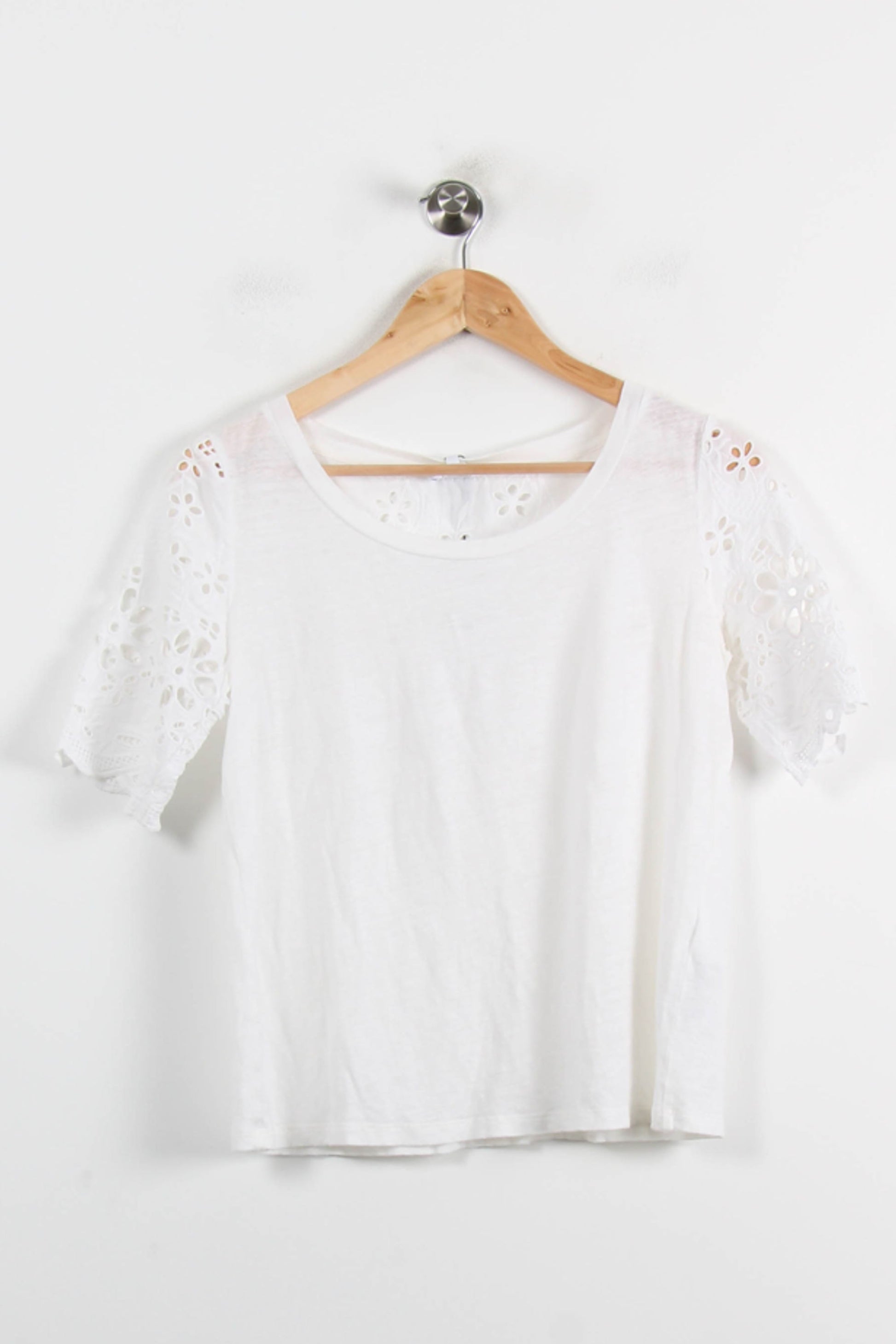 Top blanc Claudie Pierlot, taille S/36, élégant avec manches courtes en broderie anglaise. Confectionné dans une matière légère et douce, ce top se distingue par ses manches délicatement ajourées à motifs floraux, apportant une touche raffinée et féminine. Idéal pour une sortie estivale ou un déjeuner élégant en ville.
