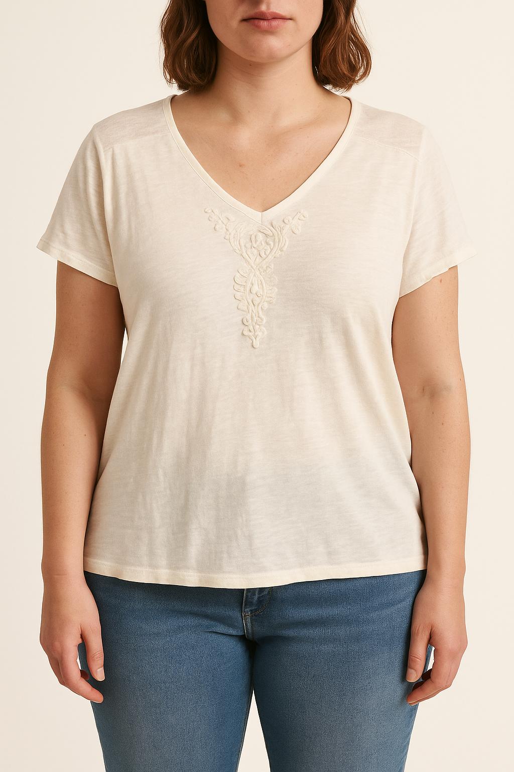 Top blanc Caroll, taille XL/42, au design épuré et élégant, parfait pour illuminer votre garde-robe. Confectionné dans une matière fluide et légère, il se distingue par son col en V délicatement orné d’une broderie ton sur ton sur le devant, apportant une touche raffinée et féminine. À porter aussi bien sous un blazer pour une journée professionnelle que seul pour une sortie décontractée entre amis.