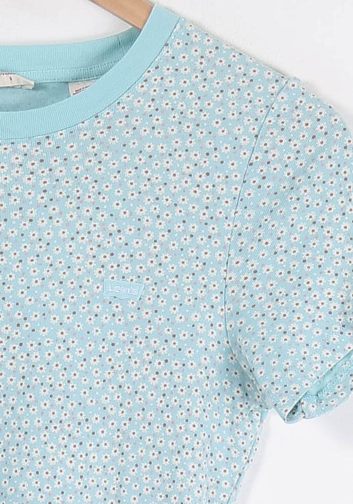 T-shirt femme Levi's bleu à petites fleurs blanches, taille S/36, modèle "Tops". La matière de ce haut n'est pas précisée, mais il se distingue par son col rond uni bleu contrastant et son imprimé floral délicat qui apporte une touche de fraîcheur et d’originalité. Idéal pour une journée estivale décontractée ou un week-end entre amis.