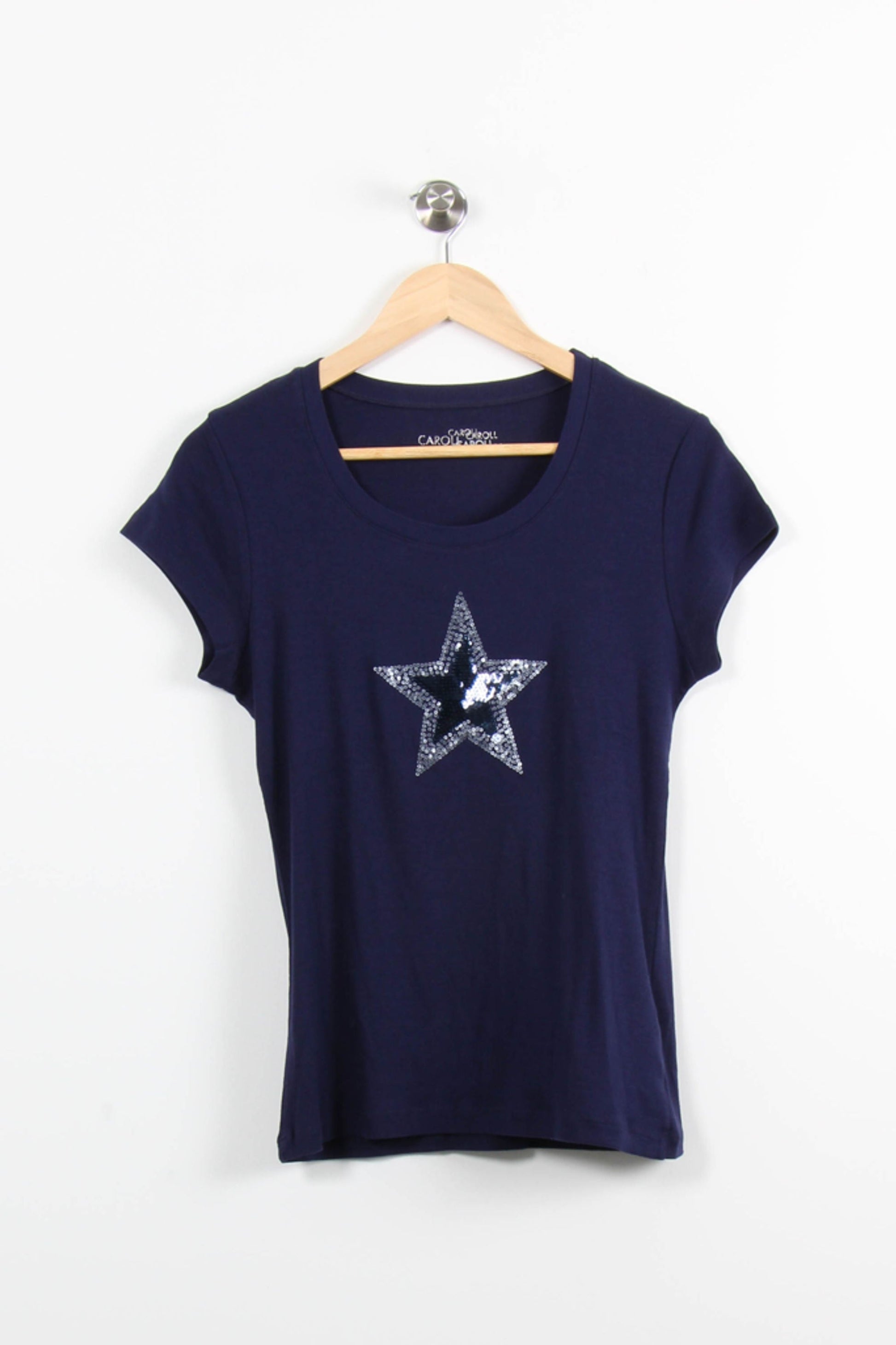 T-shirt bleu à étoile en sequins Caroll, taille XL/42, catégorie Tops, signé par la marque Caroll. Confectionné dans une matière douce et agréable, ce t-shirt se distingue par son motif étoile argentée en sequins sur le devant, apportant une touche d’originalité et de modernité à une pièce classique. Idéal pour une tenue décontractée en journée ou pour ajouter une note lumineuse à une sortie entre amis.