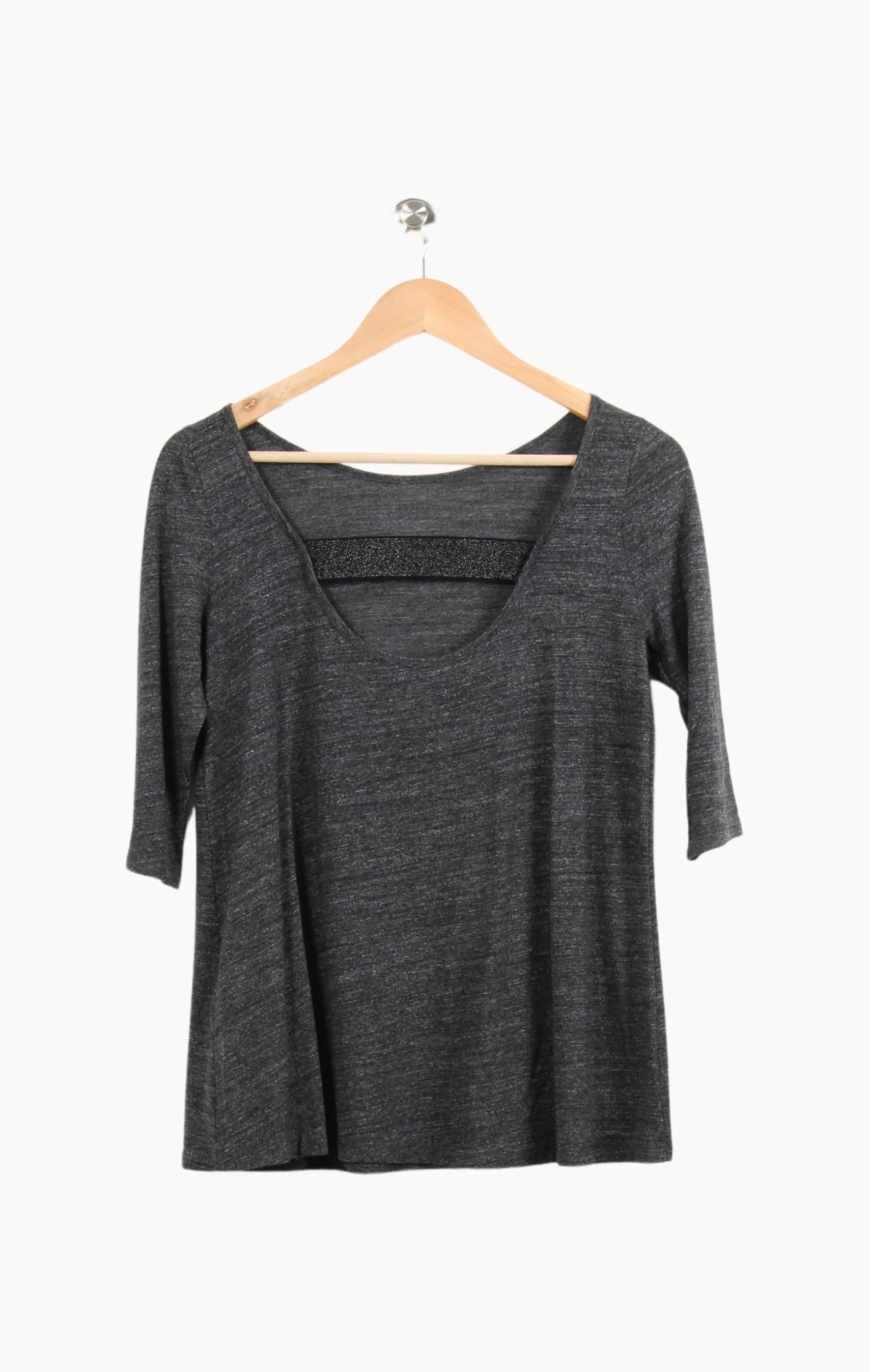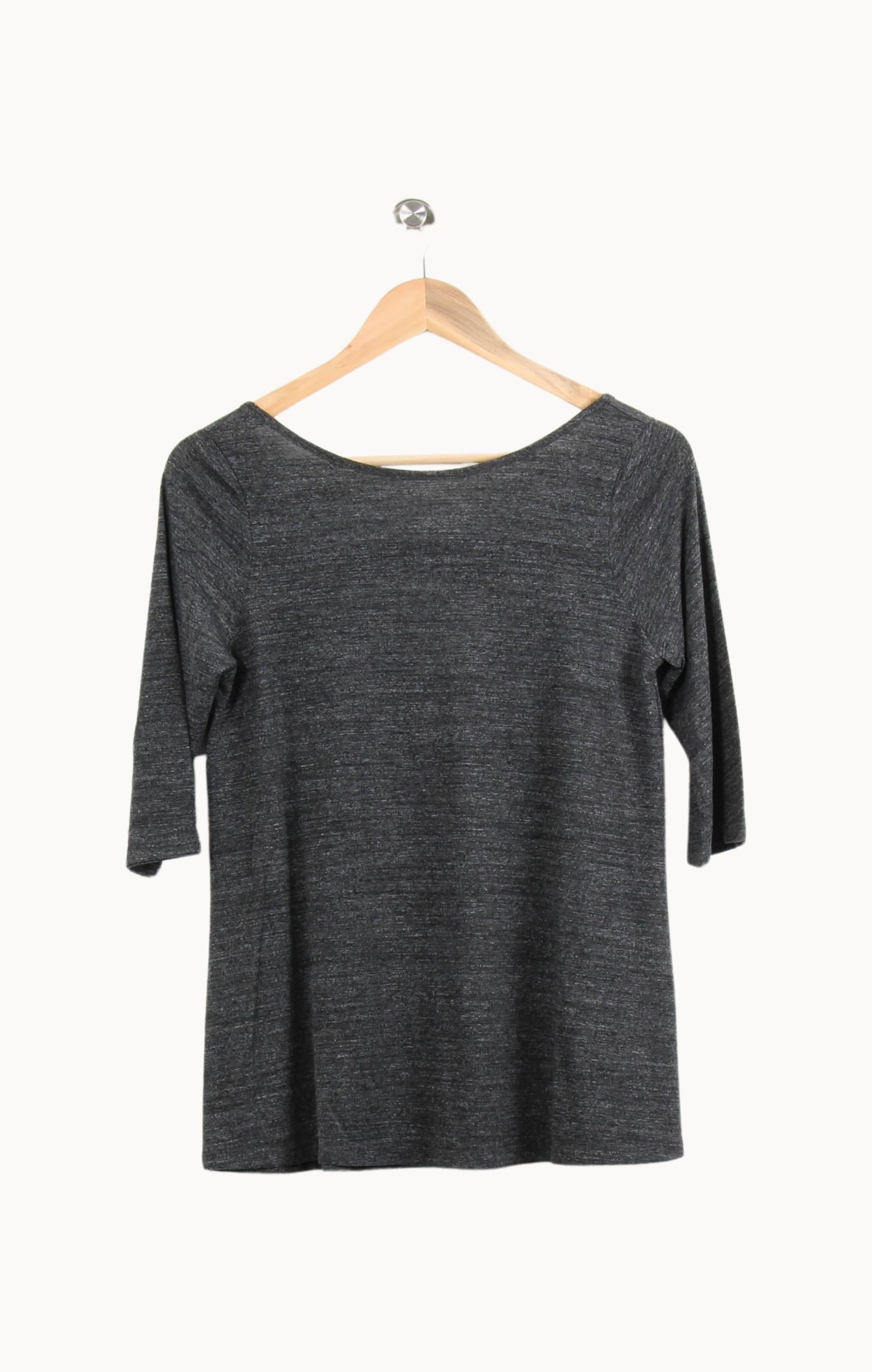 Top gris à manches 3/4 Claudie Pierlot, taille M/38 – élégance décontractée signée Claudie Pierlot. Confectionné dans une matière fluide et douce, ce modèle séduit par son profond décolleté rond et sa finition discrètement chinée, offrant un tombé naturel et une allure épurée. Ce top s’accorde parfaitement à une tenue de bureau chic, associé à un pantalon habillé et des accessoires sophistiqués.
