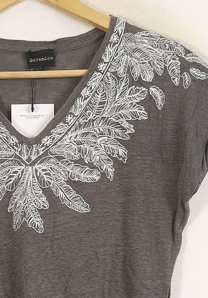 Top gris à manches courtes avec broderie feuillage, taille S/36, signé Bérénice. Confectionné dans une matière légère, il se distingue par son encolure en V agrémentée d’élégantes broderies blanches aux motifs feuillus, ajoutant une touche raffinée et unique à la pièce. Parfait pour une journée décontractée en ville ou un déjeuner entre amis.