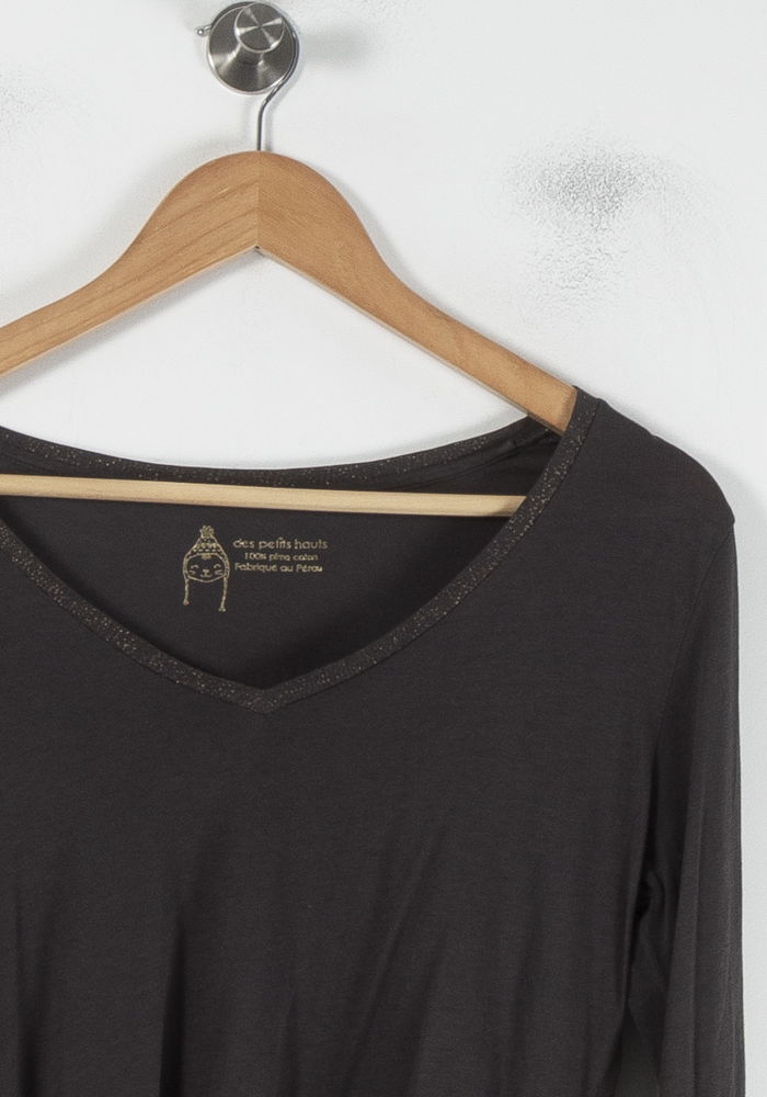 Top gris Des Petits Hauts, taille XS/34, à manches longues et col en V. Confectionné en 100% coton, il se distingue par sa maille douce et légère ainsi que par le subtil liseré métallisé qui souligne le col, apportant une touche délicate et raffinée. Idéal pour une journée décontractée ou pour composer un look casual chic au bureau.