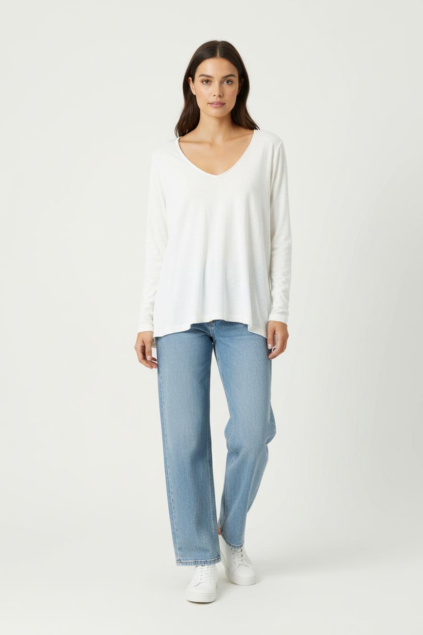 Top blanc à manches longues Des Petits Hauts, taille XL/42, offrant une coupe fluide et élégante. Confectionné en 100% coton, ce haut séduit par sa légèreté et son tombé naturel, souligné par un col en V et un ourlet légèrement asymétrique qui lui confèrent une allure résolument moderne. Parfait pour une journée décontractée au bureau ou un brunch entre amis.