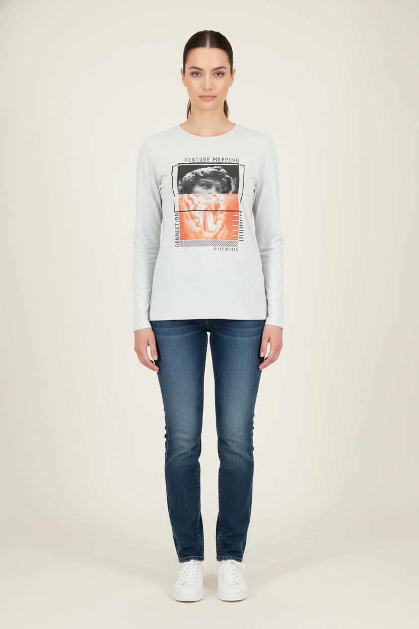 Top à manches longues gris imprimé “Texture Mapping” par IKKS, taille S/36. Confectionné dans une matière douce, ce haut se distingue par son imprimé graphique original mêlant visage classique et motif tigre, agrémenté de touches modernes pour un look unique. Idéal pour une journée décontractée en ville ou pour ajouter une touche d’originalité à une tenue casual chic.