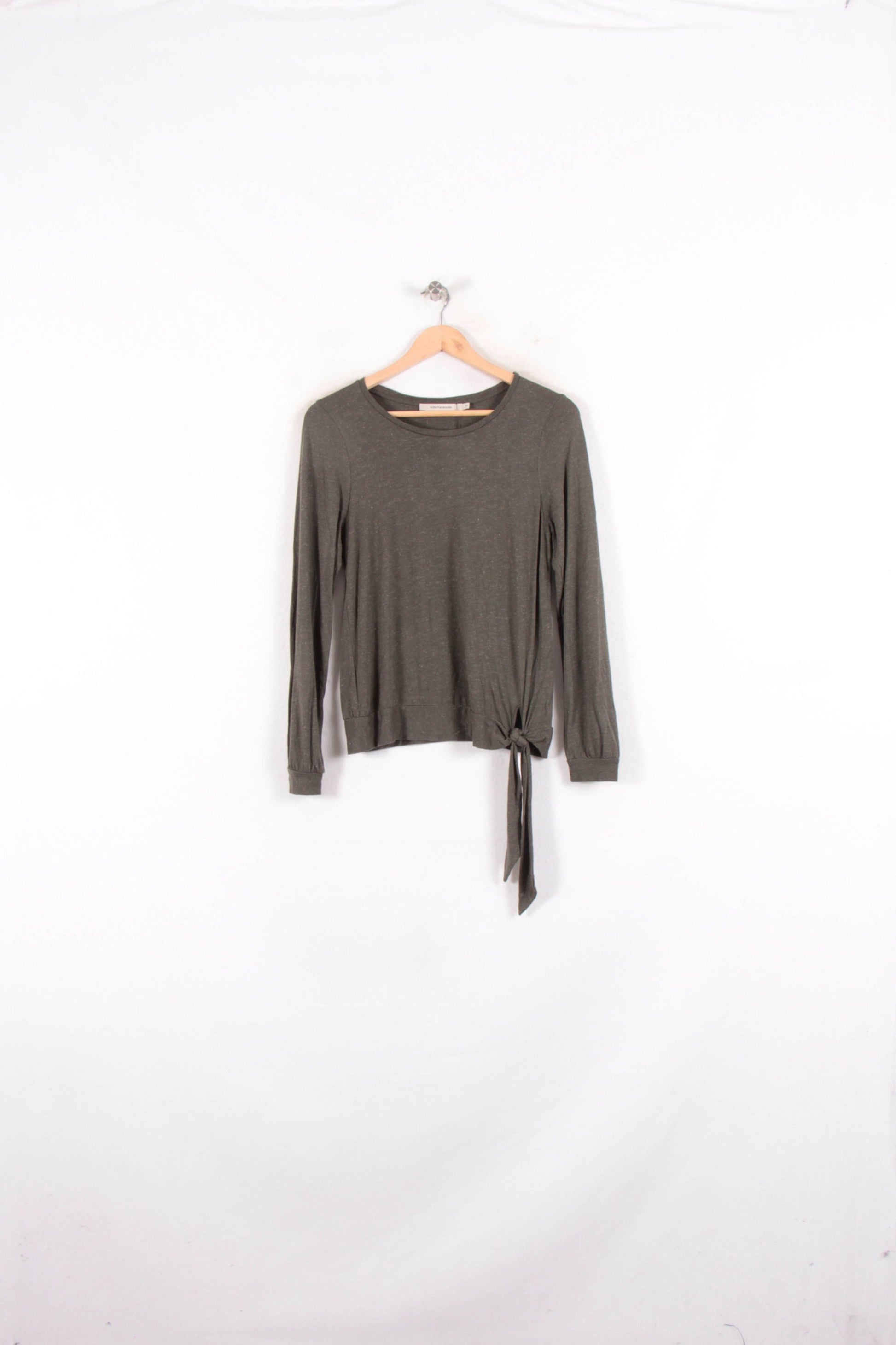 Top vert à manches longues La Fée Maraboutée, taille S/36, à la coupe droite et détail noué sur le côté. Confectionné dans une matière douce et fluide, ce top séduit par la simplicité de ses finitions et l’originalité du nœud à la taille, qui apporte une touche subtile et féminine à la silhouette. Idéal pour un déjeuner entre amis ou pour agrémenter une tenue de bureau avec élégance.