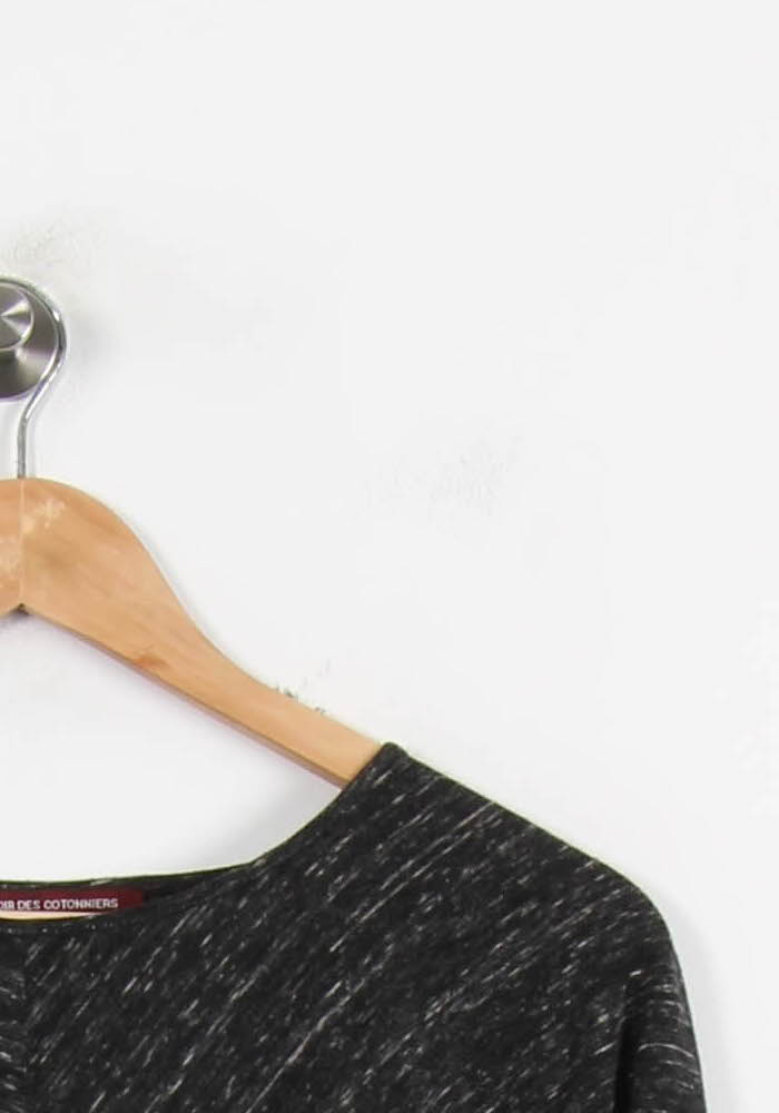 Top gris Comptoir des Cotonniers, taille S/36, à manches longues, coupe fluide et col rond. Confectionné dans une matière douce à effet chiné, il se distingue par ses lignes sobres et son tombé élégant, offrant un rendu moderne et raffiné. Parfait pour une journée au bureau associé à un pantalon tailleur ou pour un look décontracté lors d’une sortie entre amis.
