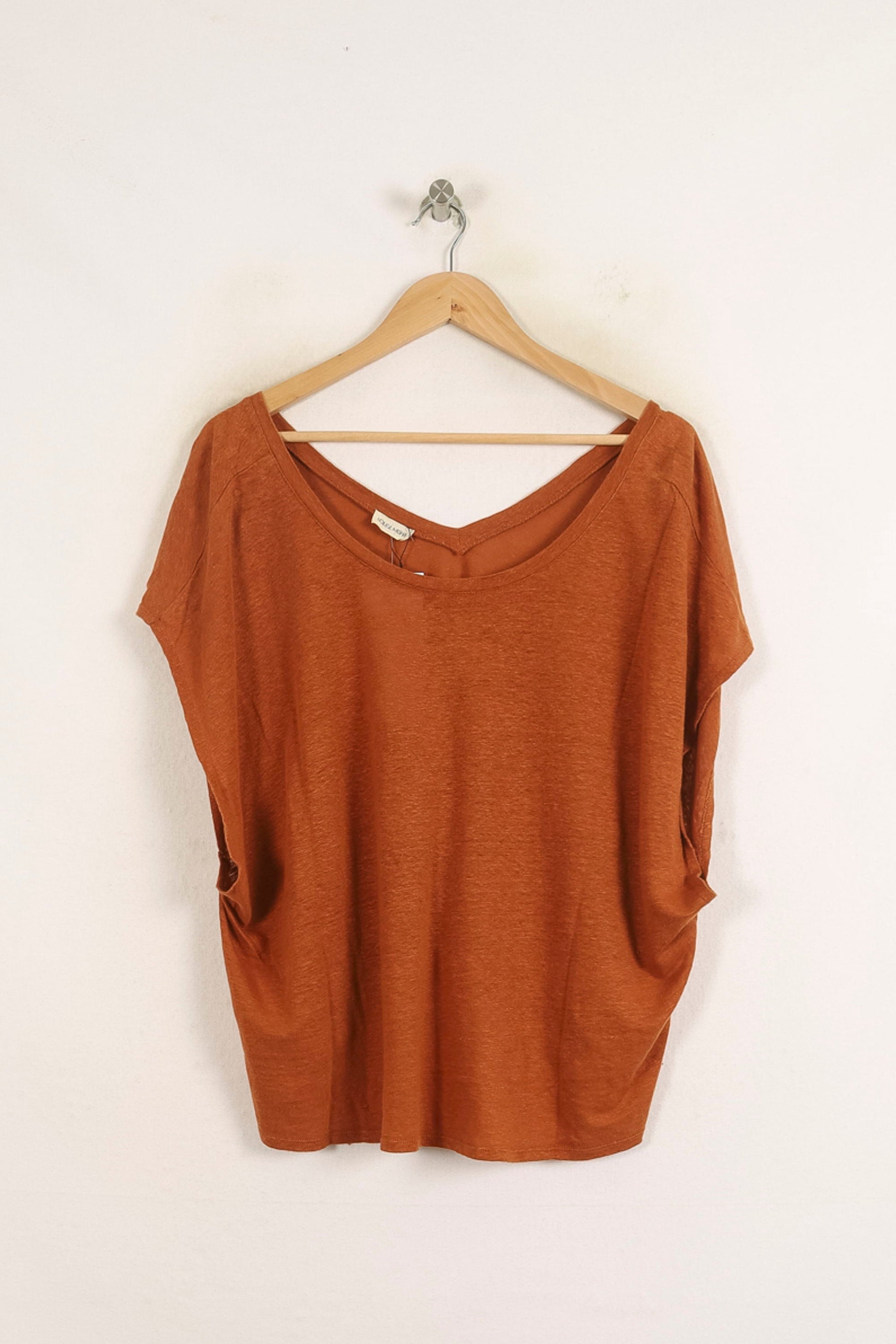 Top marron à manches courtes Louise Misha, taille S/36, offrant une allure décontractée et élégante. Confectionné dans une matière fluide au tombé naturel, ce top se distingue par sa simplicité raffinée et son encolure dégagée qui sublime la silhouette. Idéal pour une journée en ville ou une réunion informelle, il accompagne parfaitement un jean ou une jupe pour un style casual chic.