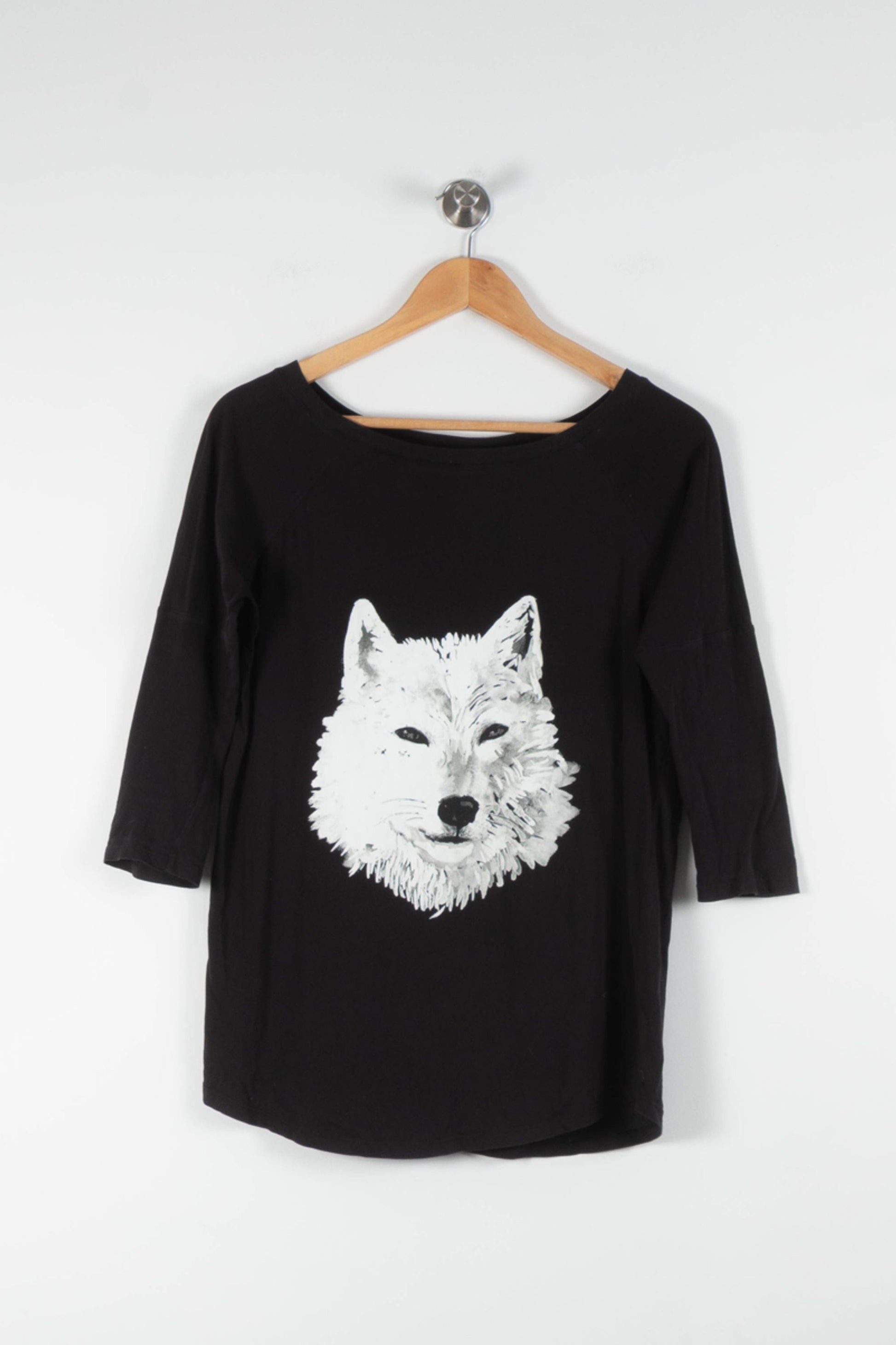 Top noir Paul & Joe Sister, taille S/36, avec imprimé graphique tête de loup sur le devant. Confectionné dans une matière douce et fluide, ce top séduit par ses manches trois-quarts et son col bateau, tandis que l’imprimé artistique du loup lui confère une touche originale et audacieuse. Idéal pour une sortie décontractée entre amis ou pour dynamiser une tenue casual chic au quotidien.