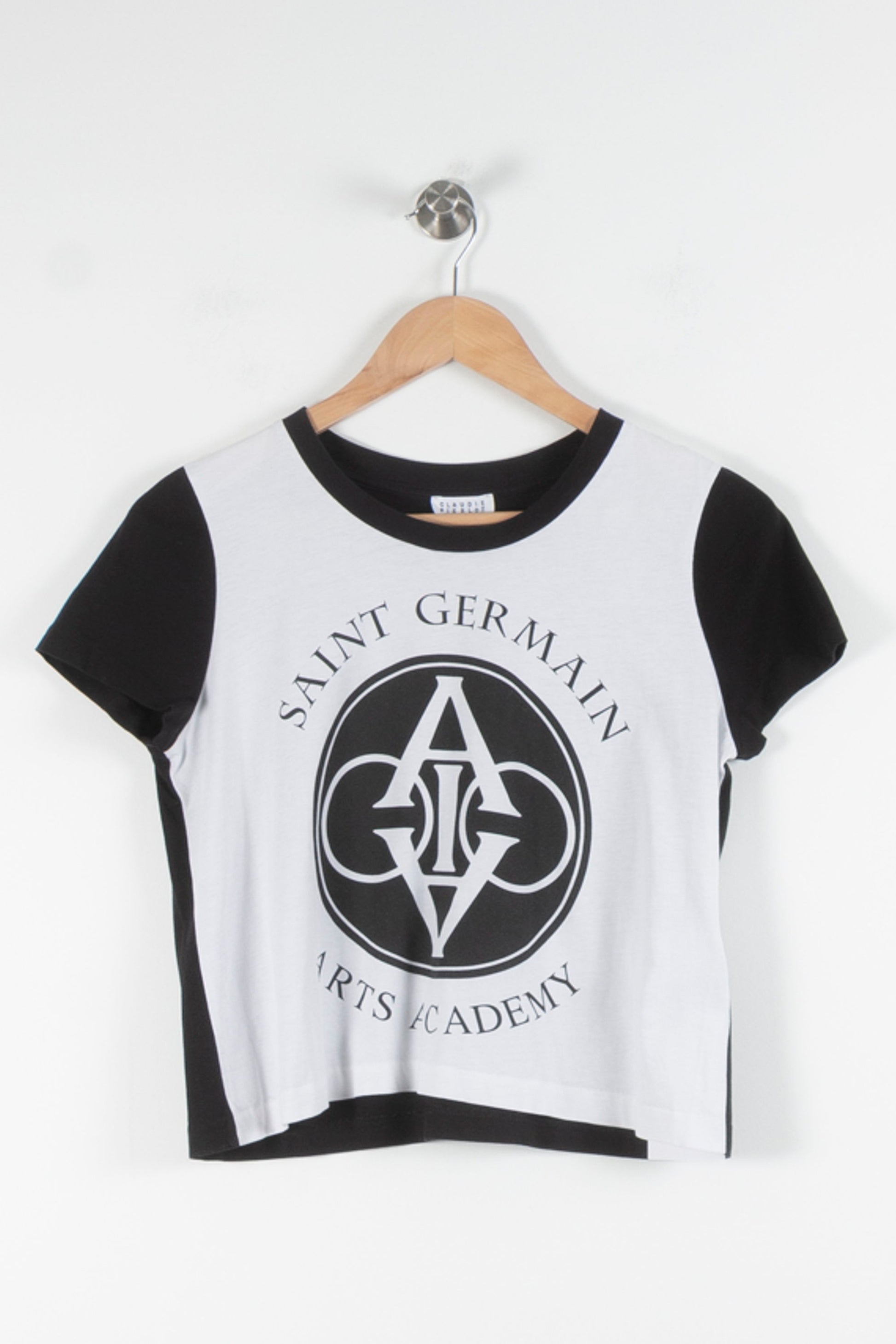 T-shirt “Saint Germain Arts Academy” Claudie Pierlot, taille S/36, noir. Confectionné en 100% coton, ce t-shirt bicolore se distingue par son large imprimé graphique en façade et ses contrastes de couleurs noir et blanc modernes et audacieux. Idéal pour une sortie décontractée en ville ou pour apporter une touche tendance à une tenue casual.