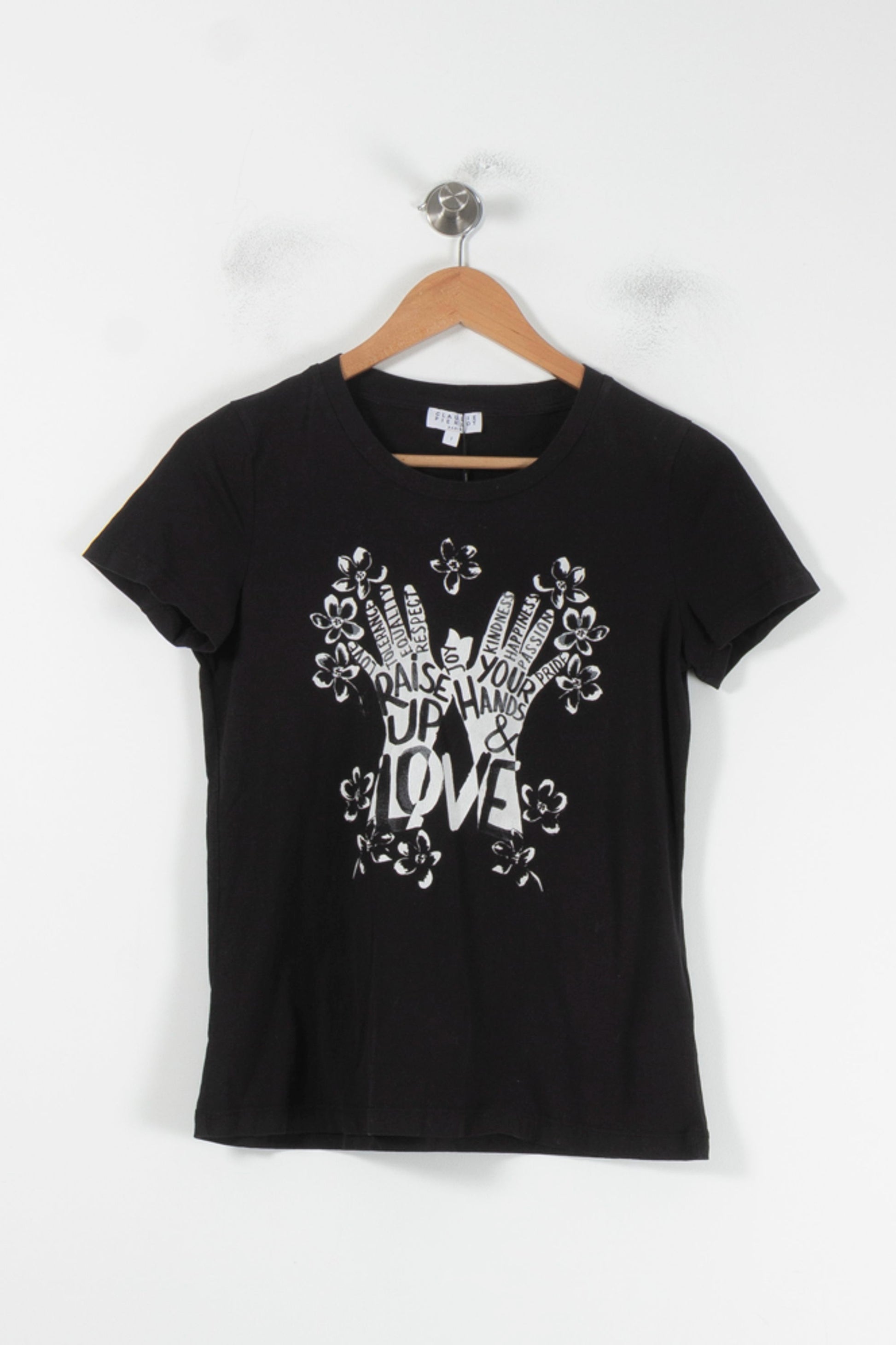 T-shirt noir Claudie Pierlot en taille S/36, orné d’un motif "Raise your hands up & love" imprimé sur le devant. Confectionné en 100% coton, ce top au toucher doux présente un imprimé original en forme de mains, agrémenté de fleurs blanches, pour une touche graphique et féminine. Ce t-shirt conviendra parfaitement à une tenue casual chic pour une sortie en ville ou un brunch entre amis.
