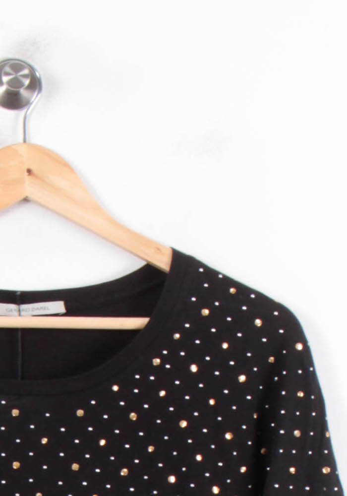 Top noir à manches courtes clouté, signé Gerard Darel, taille L/40 – un incontournable élégant pour votre garde-robe. Confectionné dans une matière fluide et douce, ce haut se distingue par ses petits clous dorés délicatement répartis sur l’ensemble du tissu, offrant une touche de lumière et un effet graphique raffiné. Idéal pour une soirée entre amis ou une sortie en ville, ce top saura apporter chic et modernité à votre tenue.