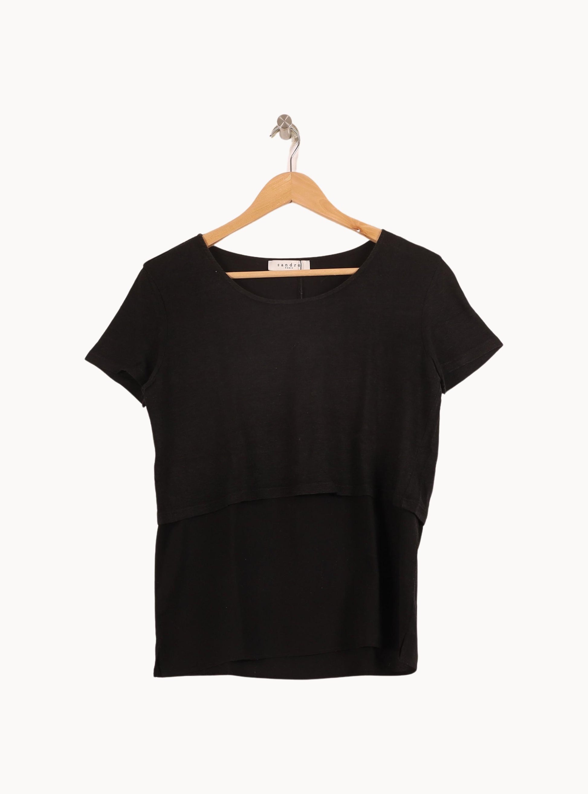 Top noir Sandro, manches courtes, taille L/40 – un basique élégant signé par la marque réputée. Le haut présente une matière fluide et douce avec un jeu de superposition sobre, accentuant la singularité du modèle tout en restant discret et sophistiqué. Idéal pour une journée de travail ou une sortie décontractée, ce top s’adapte à toutes les occasions du quotidien.