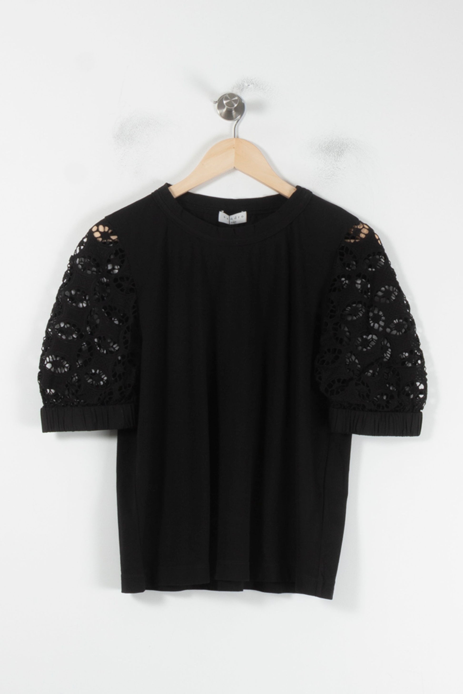 Top noir Sandro à manches courtes ajourées en taille L/40, élégant et moderne. Confectionné en 100% coton, il séduit par la qualité de son tissu et l’originalité de ses manches travaillées en broderie ajourée qui ajoutent une touche sophistiquée à une silhouette sobre. Idéal pour une sortie entre amis ou un dîner en ville, ce top garantit un style chic en toute simplicité.