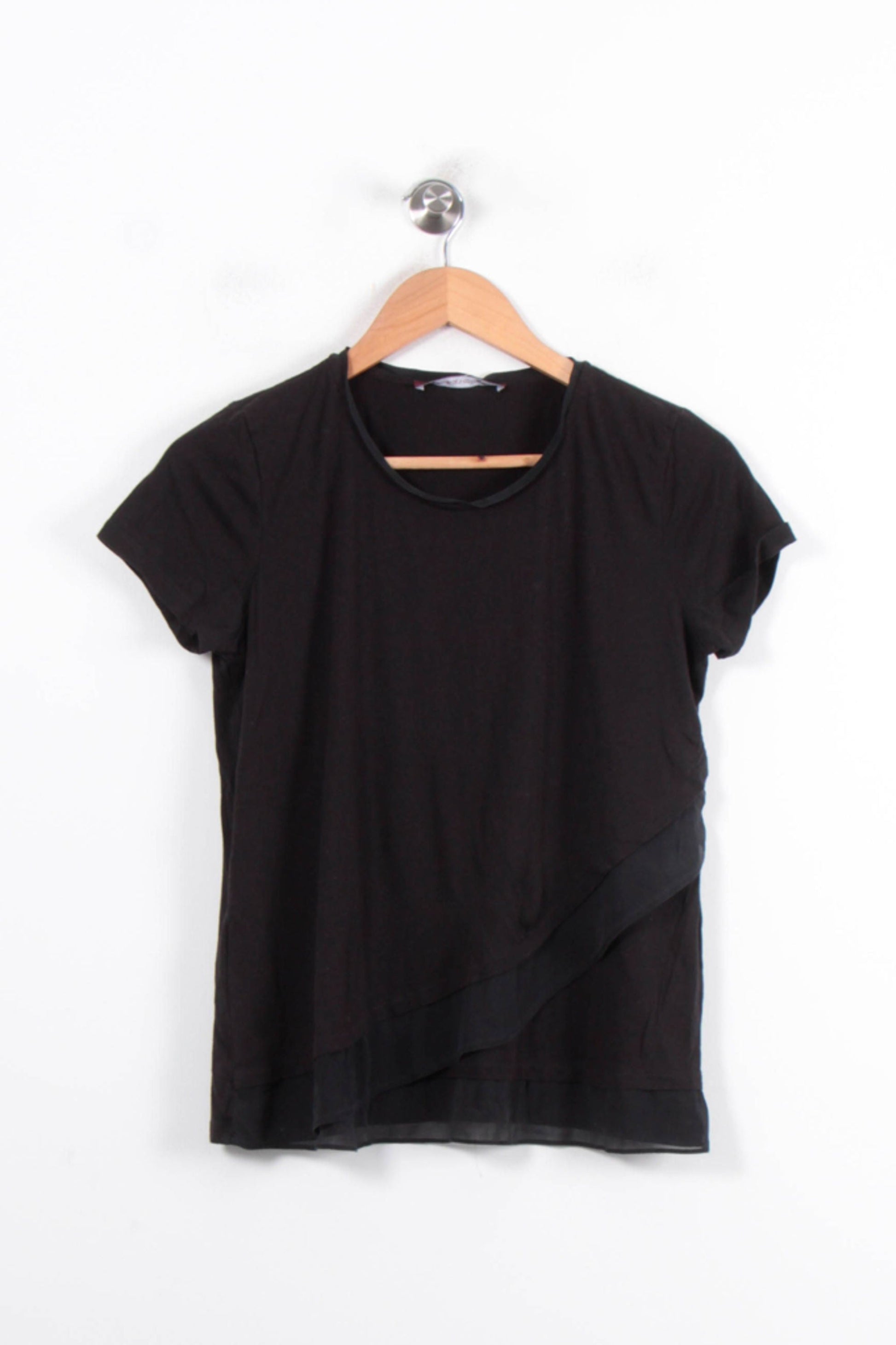 Top noir Comptoir des Cotonniers en taille M/38, à manches courtes et col rond, idéal pour une allure sobre et raffinée. Ce modèle se distingue par un jeu subtil de matières avec un voile transparent asymétrique sur le bas, apportant une touche d’originalité et de modernité. Parfait pour une journée de travail ou une sortie décontractée, associé à un pantalon élégant ou une jupe fluide.
