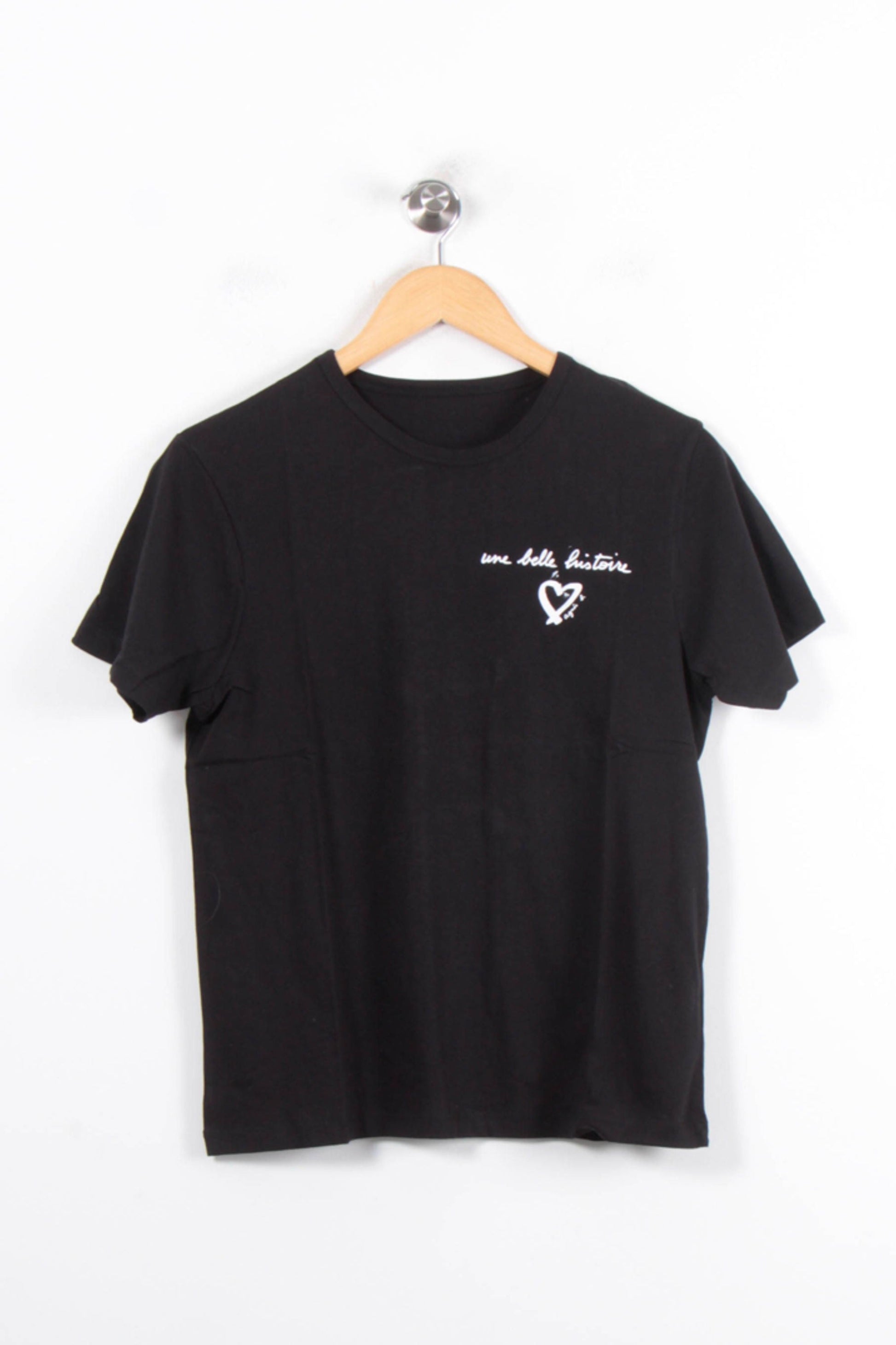 T-shirt noir "une belle histoire" Agnès b., taille T.U., idéal pour un look intemporel et décontracté. Confectionné dans une matière douce et confortable, ce t-shirt se distingue par son inscription blanche délicate et le motif cœur brodé sur la poitrine, signature élégante de la marque. Parfait pour une journée citadine ou un rendez-vous entre amis, il apportera une touche graphique et raffinée à vos tenues quotidiennes.