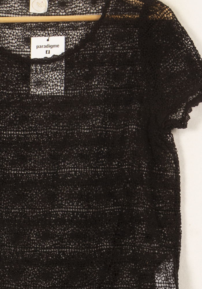 Top noir Des Petits Hauts en taille XL/42, élégant et léger, idéal pour compléter une garde-robe raffinée. Sa maille ajourée révèle un travail délicat qui confère une touche de modernité et de féminité, tout en valorisant la qualité du tissu et le savoir-faire de la marque. Parfait pour une sortie estivale chic ou un dîner élégant en toute décontraction.