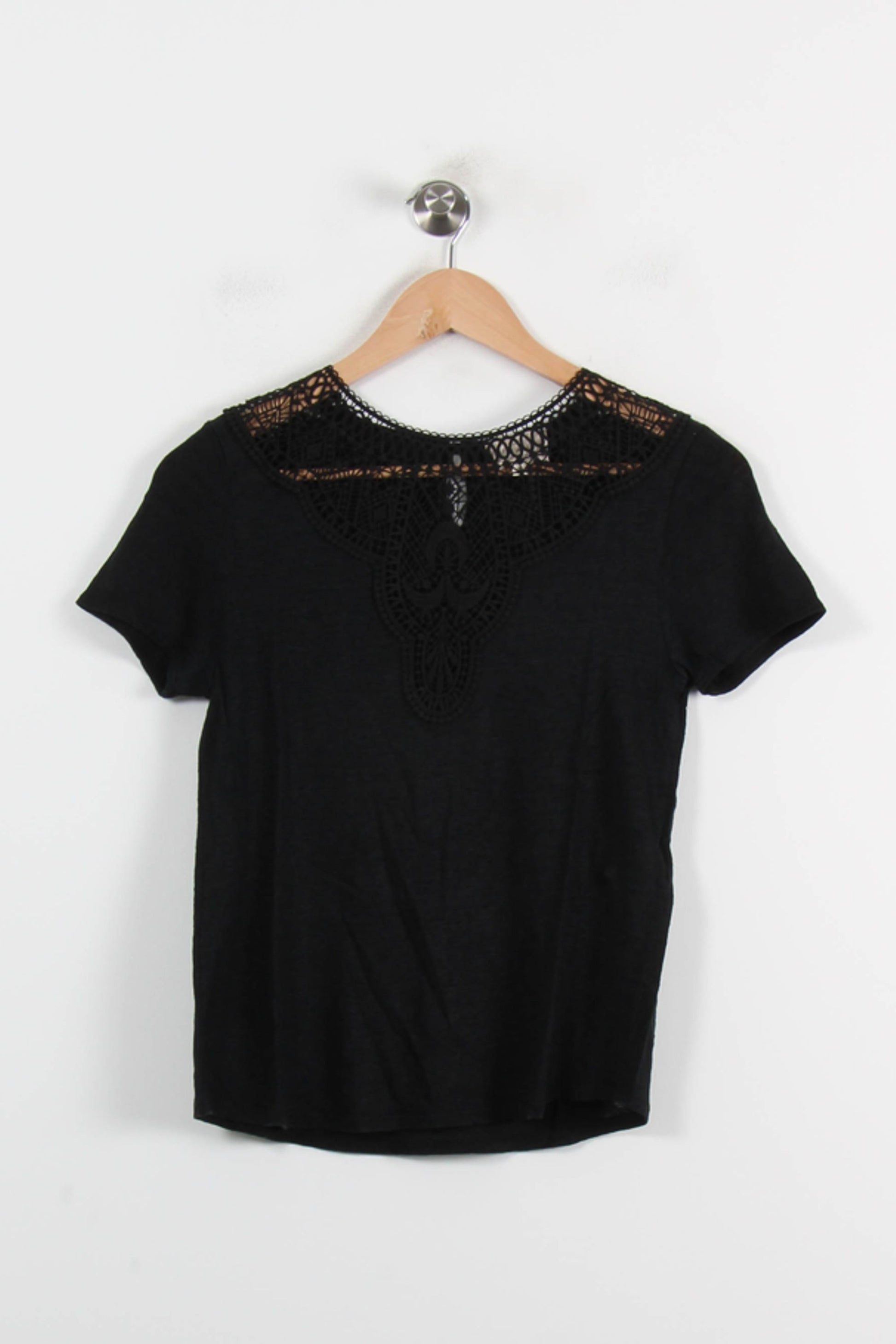 Top noir Sézane en taille XS/34, à manches courtes, élégant et intemporel. Sa matière semble douce et souple, sublimée par un empiècement en dentelle ajourée au niveau du col qui apporte une touche raffinée et féminine, rendant chaque pièce unique par son travail délicat. Ce haut sera idéal pour une soirée entre amis ou pour apporter une note chic à une tenue de bureau.