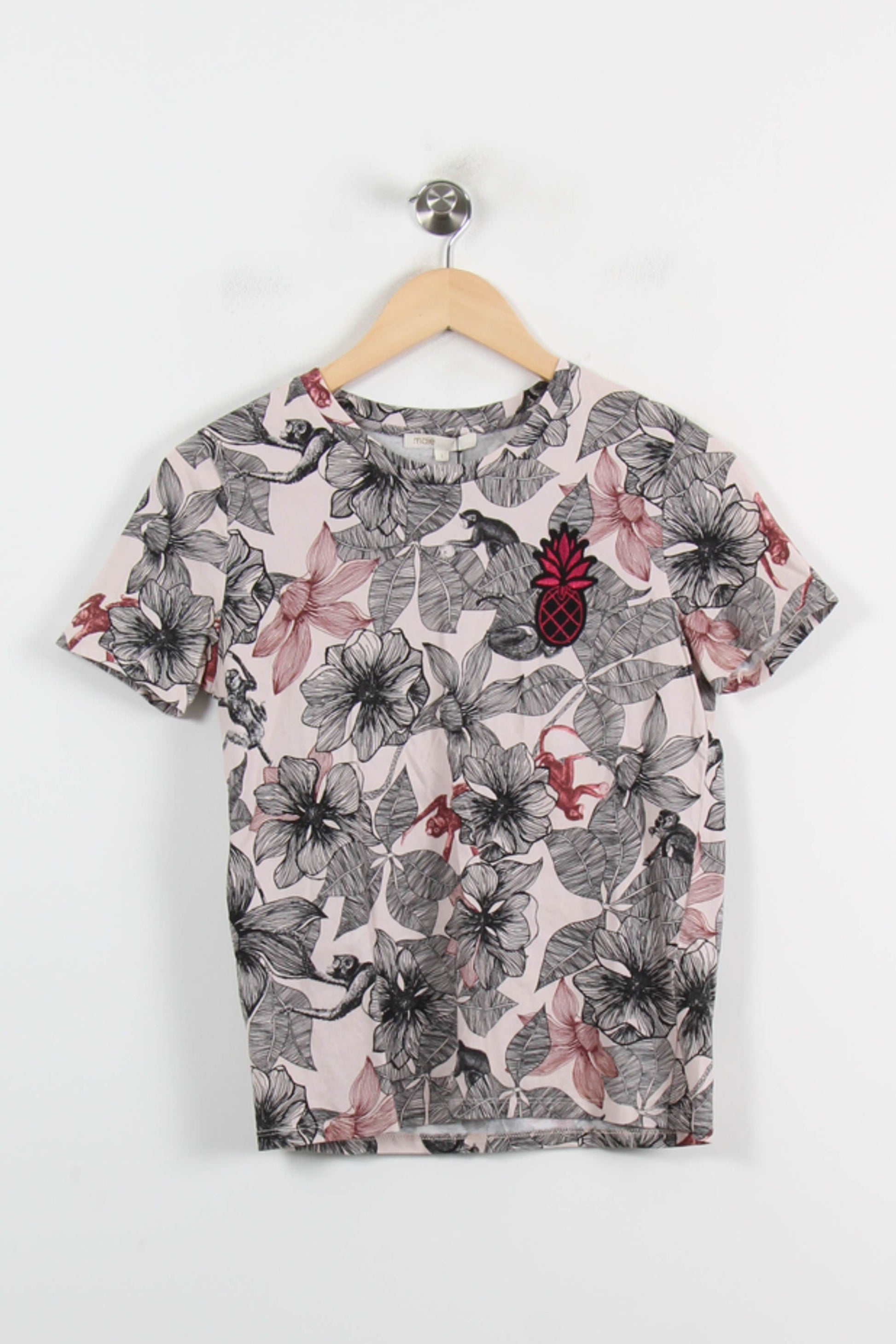 Top imprimé fleuri Maje, multicolore, taille S/36. Confectionné dans une matière légère, ce top se distingue par son imprimé floral sophistiqué relevé de motifs de singes et d’un élégant patch ananas brodé sur la poitrine, ajoutant une touche d’originalité raffinée à la pièce. Idéal pour une journée estivale ou un déjeuner en terrasse, il apporte fraîcheur et caractère à votre silhouette.