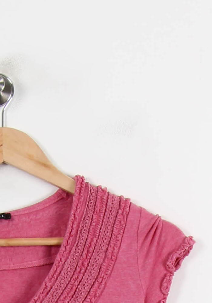 Top rose Caroll, taille S/36, à manches courtes et encolure en V ornée de boutons et de finitions plissées. La matière légère du top est sublimée par des détails de dentelle délicate autour du décolleté et des manches, apportant une touche de raffinement au modèle, tandis que la patte de boutonnage sur le devant ajoute une finition élégante. Ce haut est idéal pour une journée décontractée au bureau ou une sortie printanière entre amis.