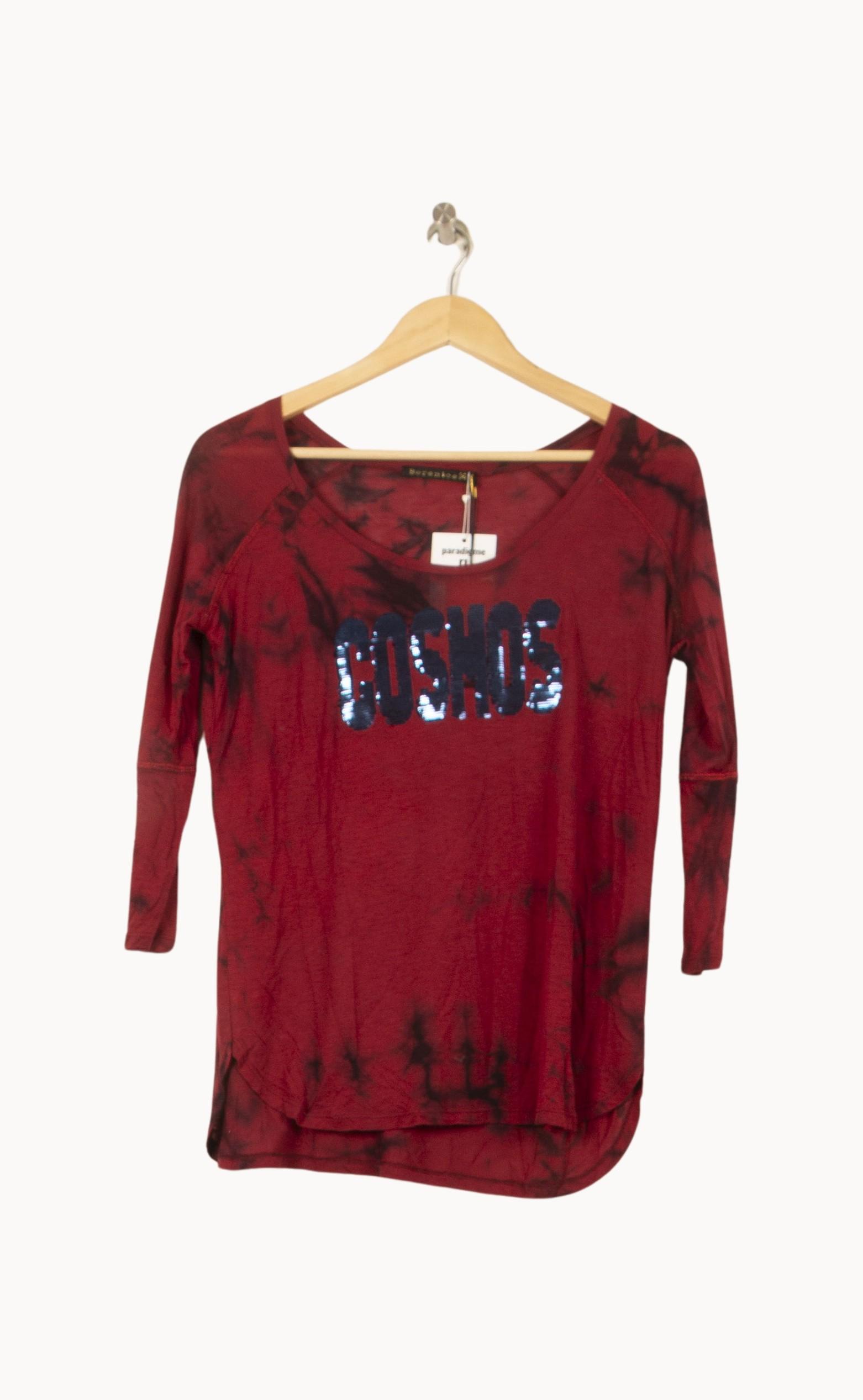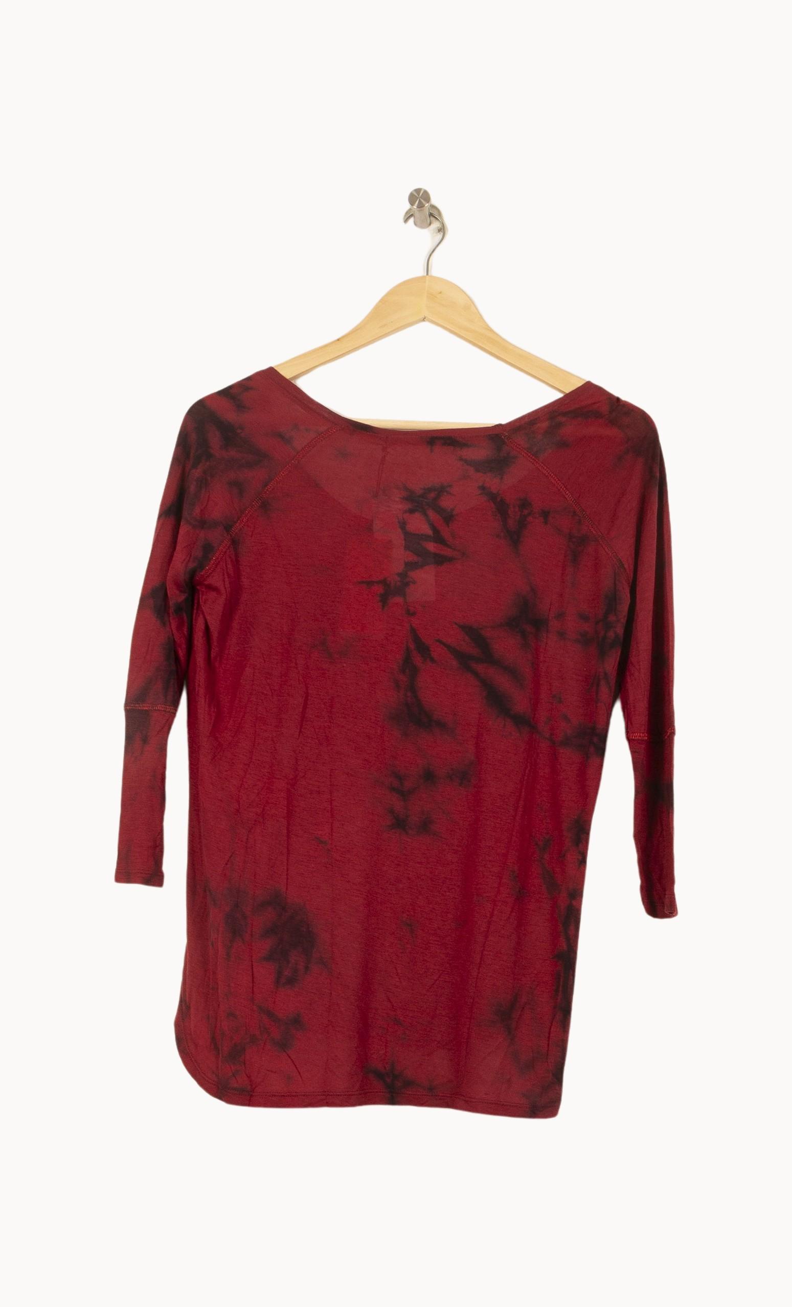 Top à manches courtes Bérénice, taille S/36, dans une élégante teinte rouge avec effet tie and dye noir. Confectionné dans une matière douce et confortable, ce modèle séduit par son motif original et son aspect légèrement délavé, qui lui confère une touche moderne et graphique. Idéal à porter lors d’une journée décontractée en ville pour apporter une note tendance à votre tenue casual.
