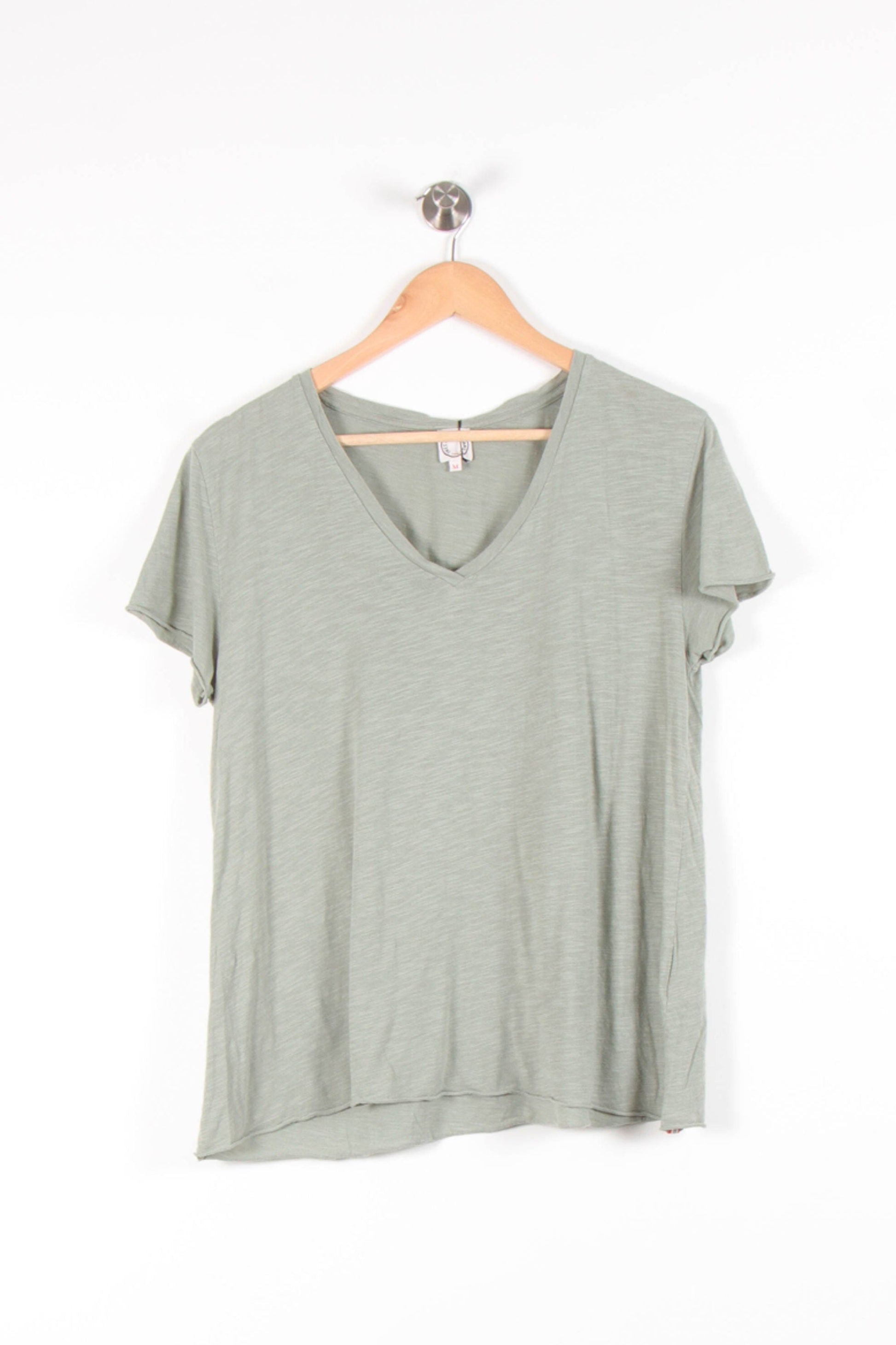 Top vert col V Ines de la Fressange Paris, taille M/38 : ce haut à manches courtes séduit par sa simplicité élégante et sa coupe décontractée. Confectionné dans une matière légère et douce, il se distingue par son tombé naturel et son fini légèrement chiné qui lui confère une allure unique. Idéal pour une journée de travail décontractée ou un après-midi en ville, il s’associe facilement à toutes vos tenues.